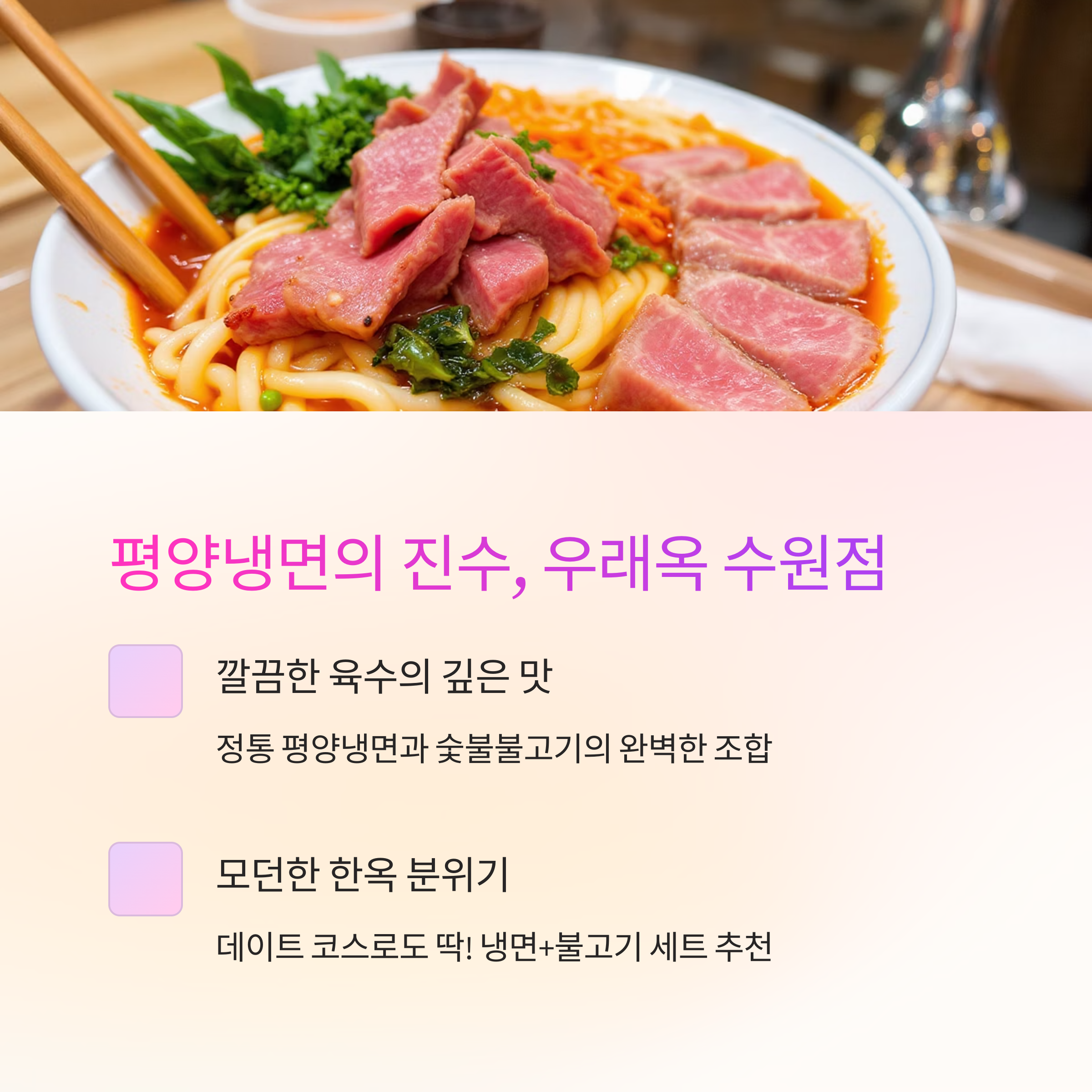 👉 추천 메뉴: 평양냉면 + 숯불불고기 세트