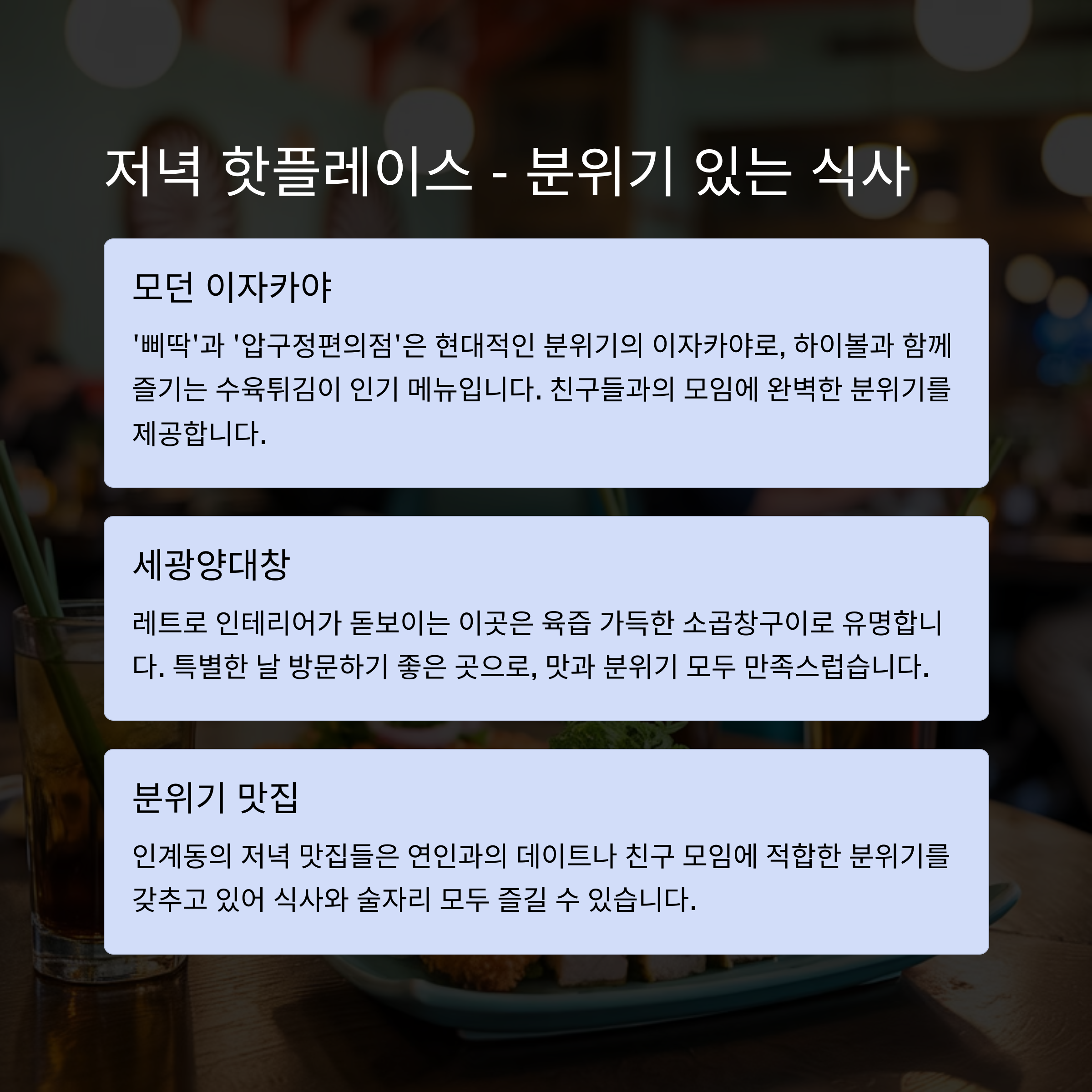인계동에는 다양한 컨셉의 저녁 식사 장소가 있어 취향대로 선택할 수 있습니다