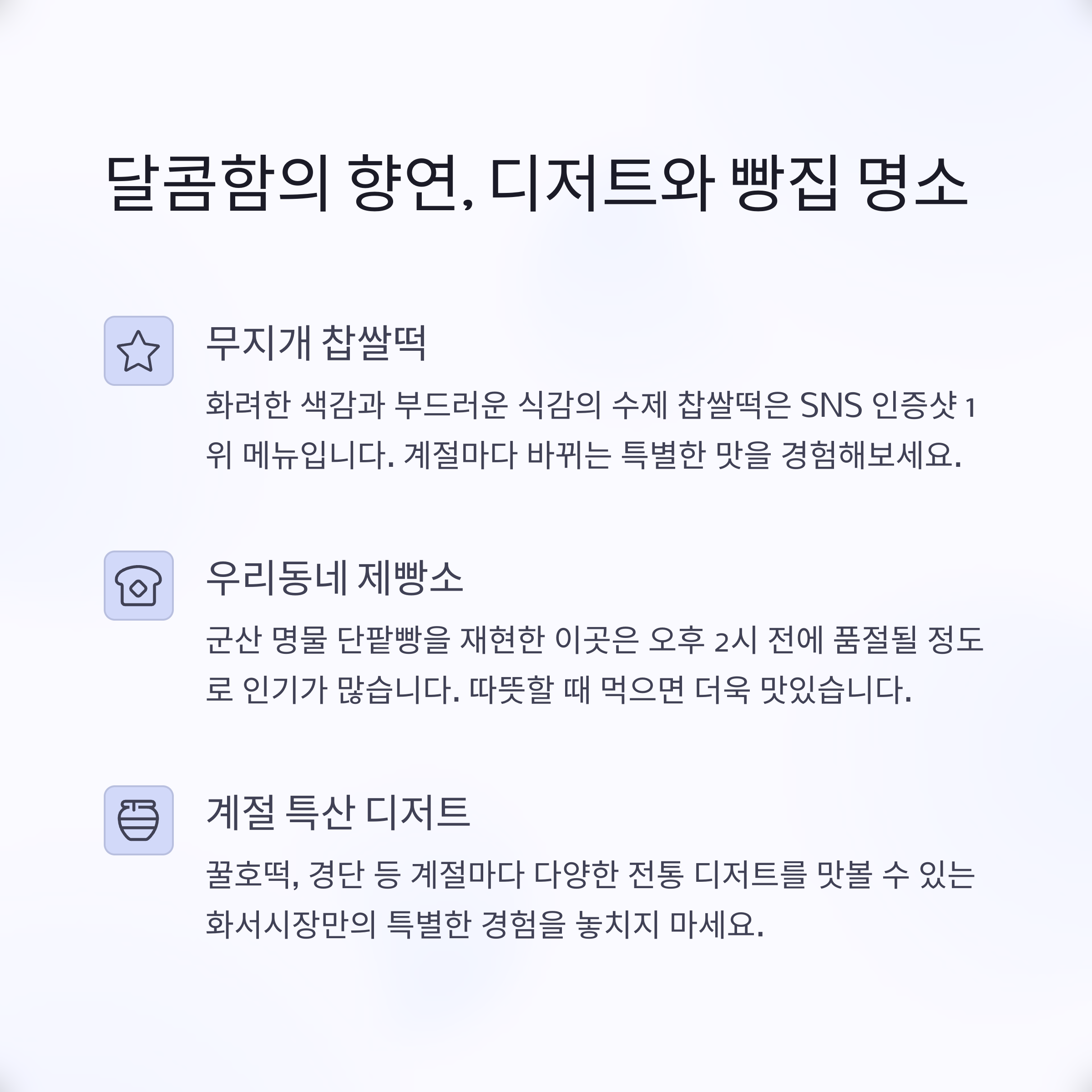 "찹쌀도넛, 약과, 꿀빵 같은 달콤한 간식이 기다리고 있어요"