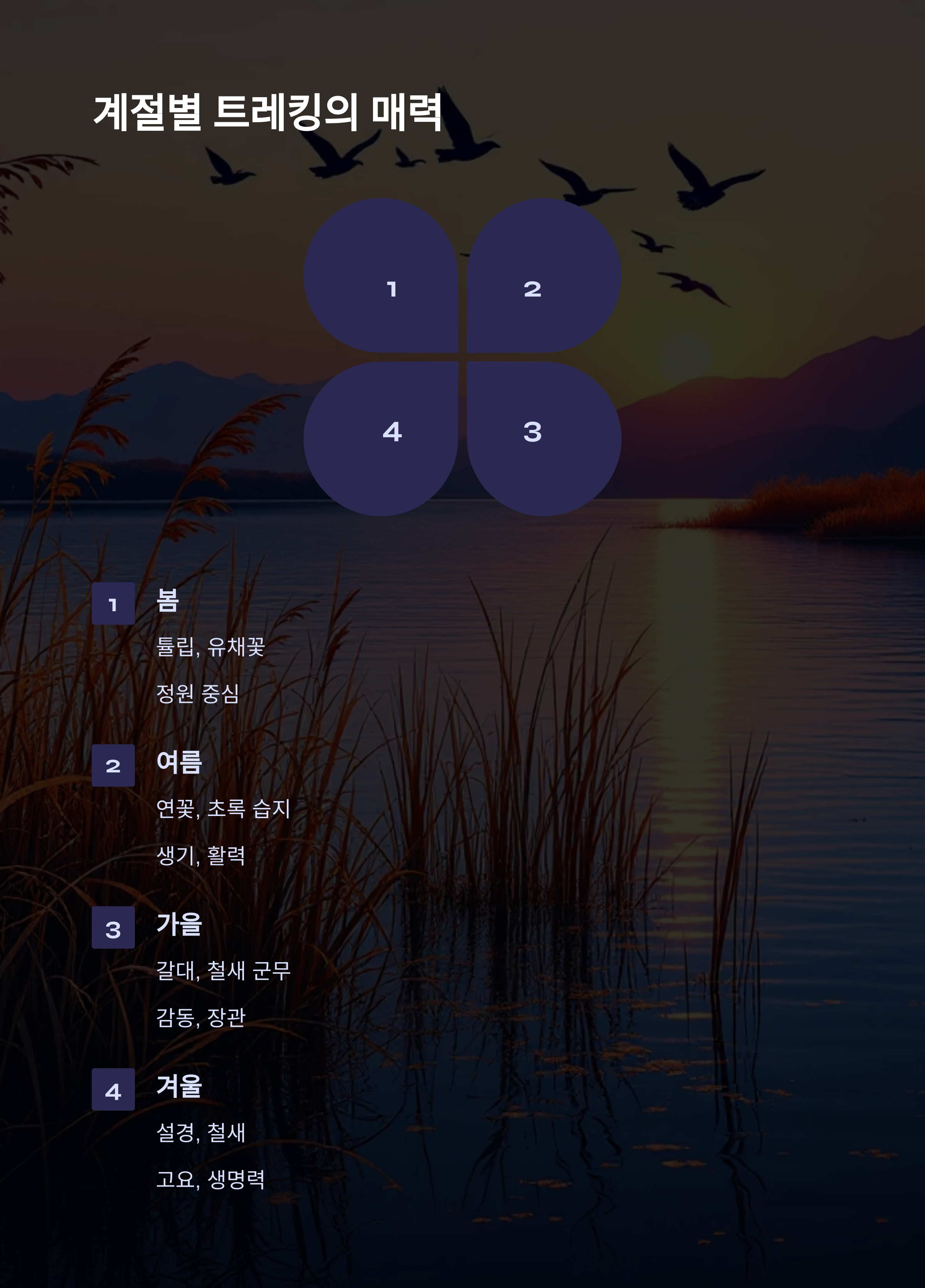 | 가을 | 갈대, 철새 군무 | 감동, 장관 |