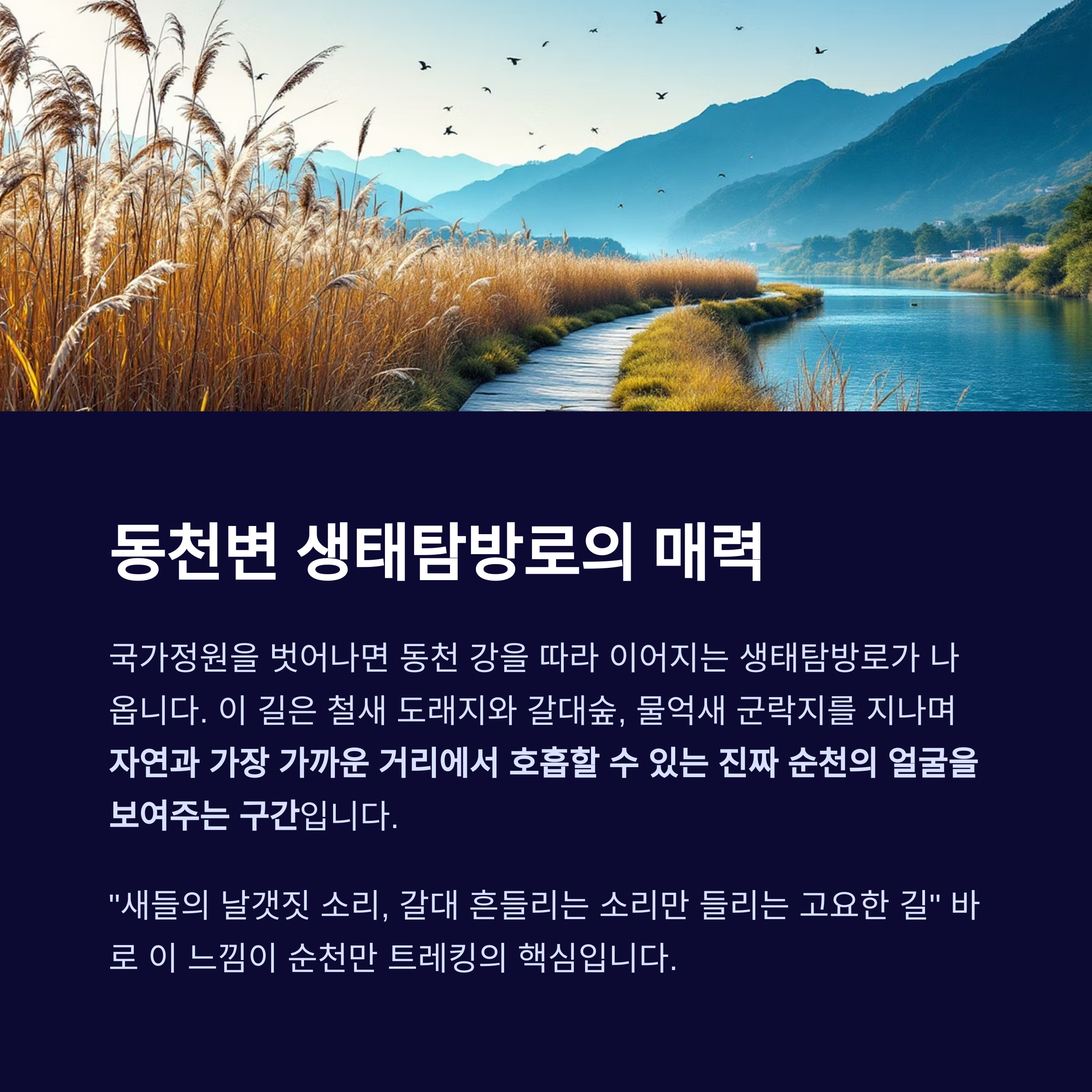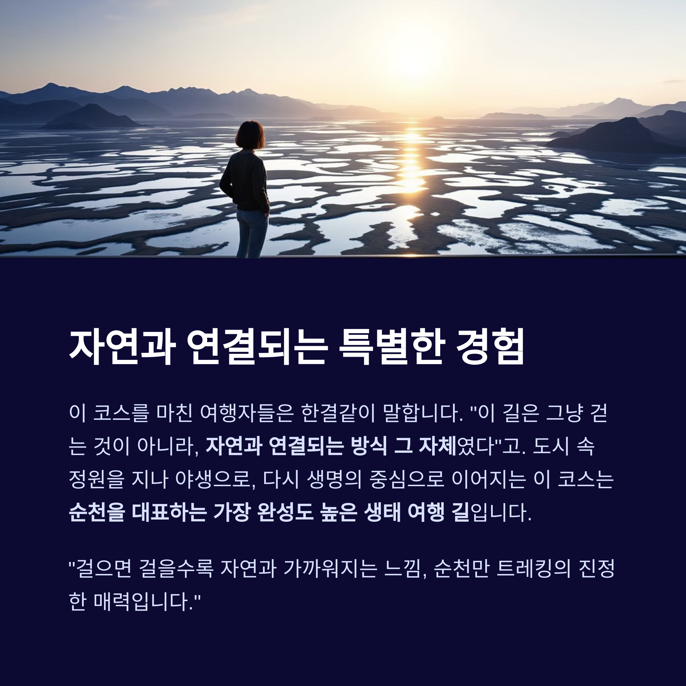 "걸으면 걸을수록 자연과 가까워지는 느낌, 순천만 트레킹의 진정한 매력입니다."