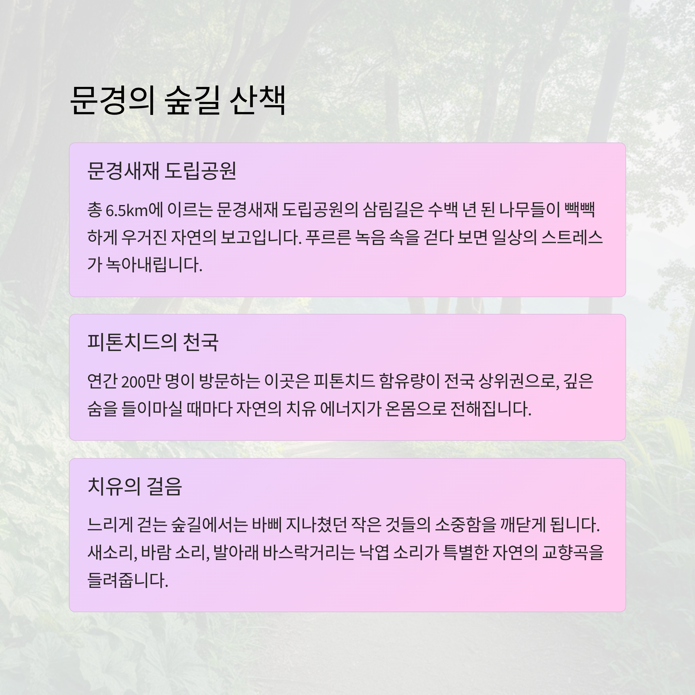 우리는 종종 더 멀고, 더 크고, 더 유명한 곳만을 쫓아 떠나지만 진짜 쉼은 작고 고요한 마을 속에 숨어 있습니다. 강원도의 파도, 해남의 노을, 강화도의 한적한 골목, 문경의 숲길. 그 속에서 마주한 바람과 햇살은 잊고 있던 나를 조용히 안아줍니다.
