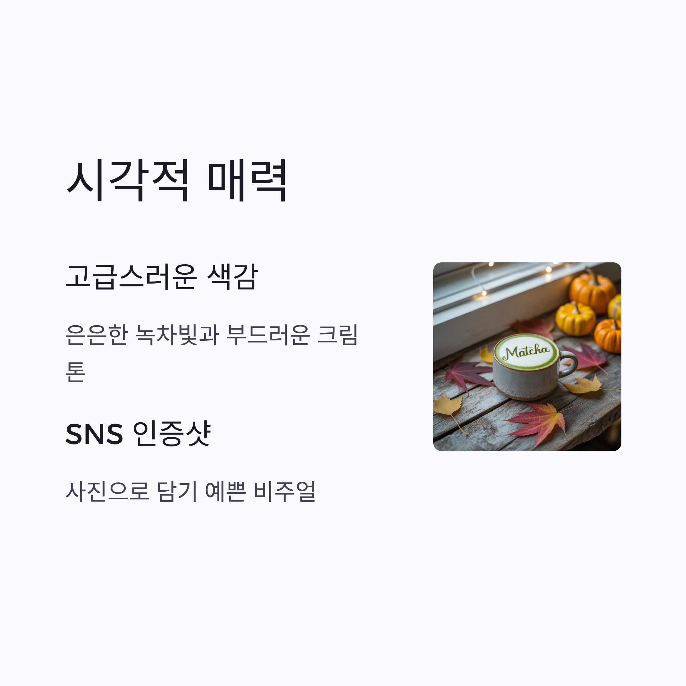음료의 색감은 은은한 녹차빛에 부드러운 크림 톤이 더해져 고급스러운 분위기를 자아내요. 사진으로 담기에도 예쁘고, SNS에 공유하고 싶은 비주얼을 지니고 있어요.