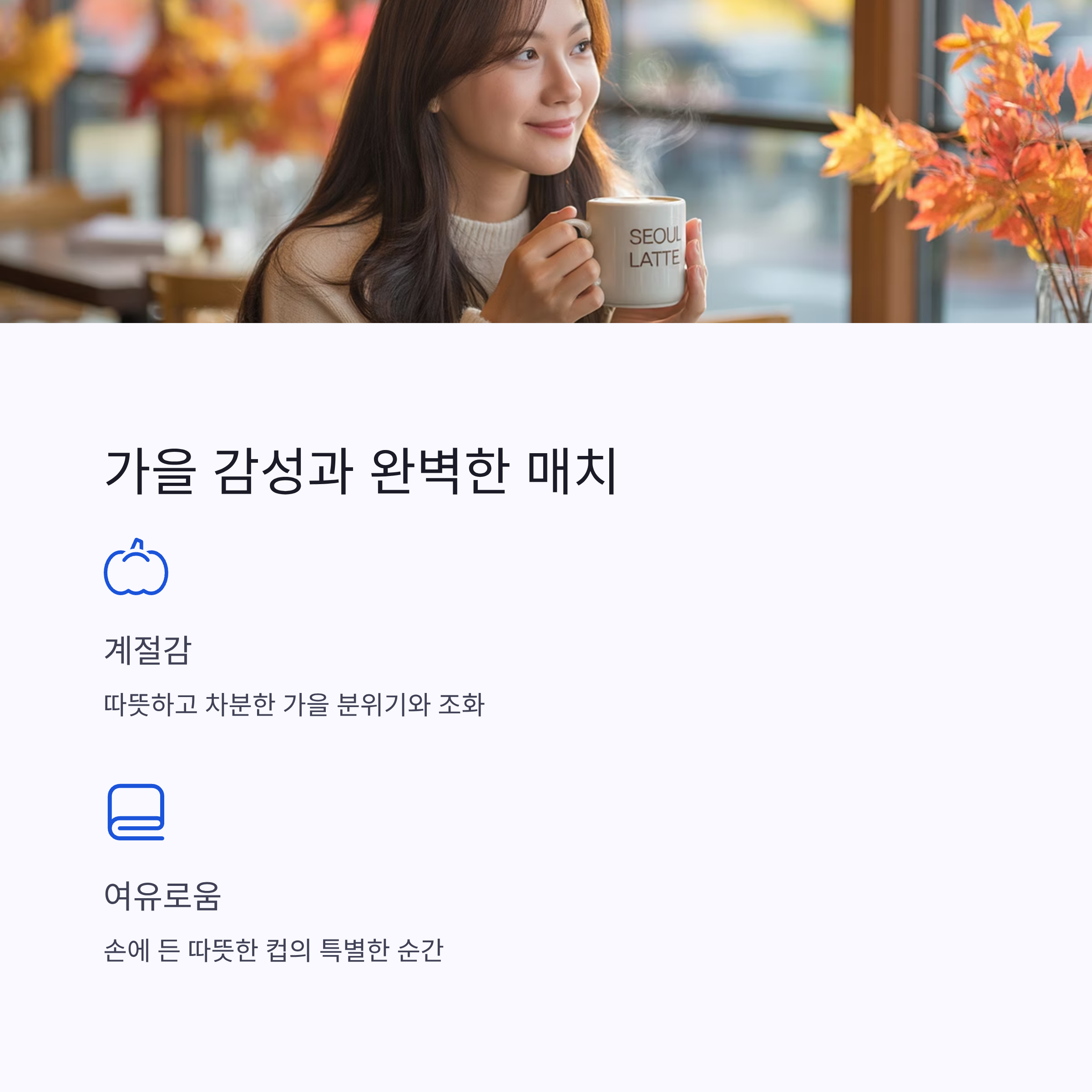 가을 하면 따뜻하고 차분한 분위기를 떠올리게 되는데요, 이 음료는 바로 그런 계절감과 잘 맞아떨어져요. 손에 따뜻한 컵을 들고 한 모금 마실 때 느껴지는 여유로움이 계절을 더 특별하게 만들어 주죠.
