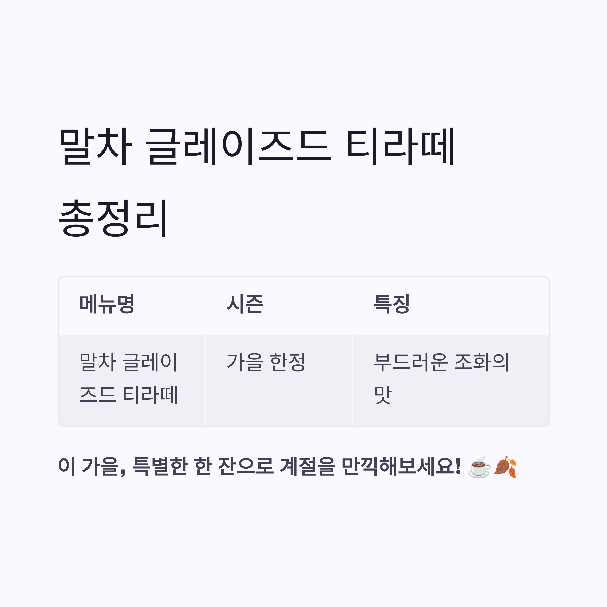 | 말차 글레이즈드 티라떼 | 가을 한정 출시 | 부드러운 말차와 달콤한 글레이즈드 조화 |