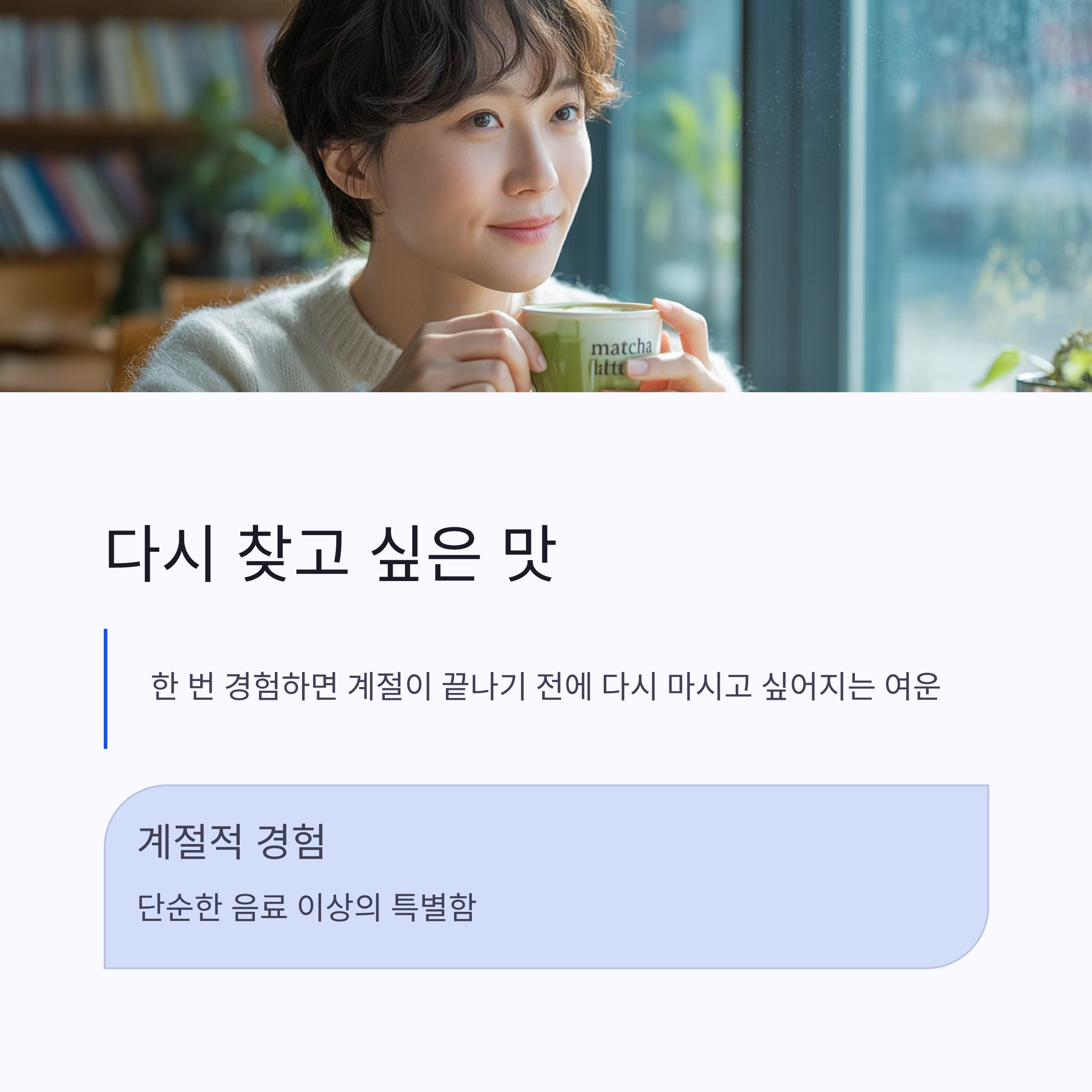 한번 경험해 보면, 이 계절이 끝나기 전에 다시 한 번 맛보고 싶다는 생각이 들 만큼 여운이 남아요. 단순히 음료 이상의 계절적 경험으로 다가오는 것이 큰 특징이에요.