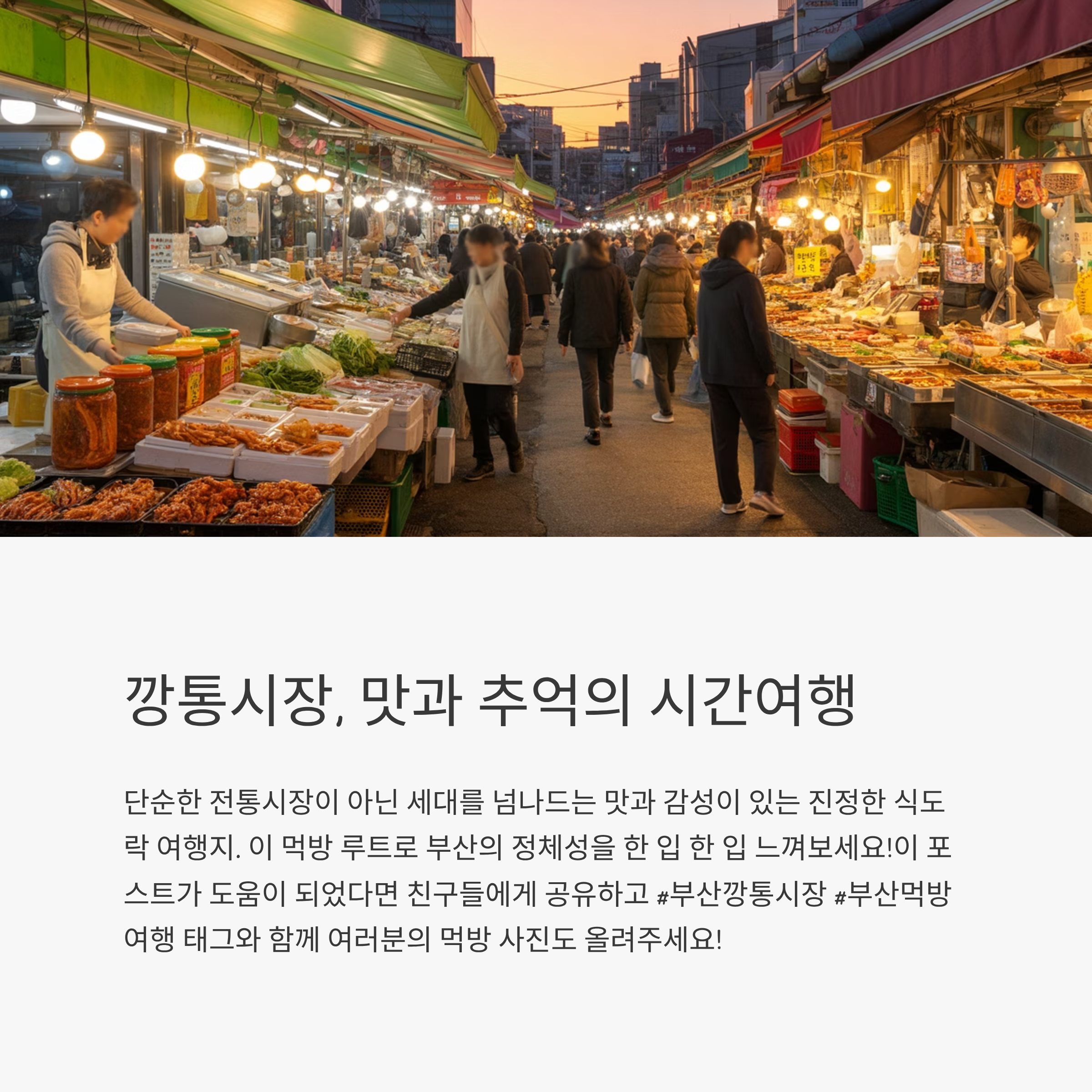 부산을 대표하는 전통시장 중 하나인 깡통시장은 단순한 재래시장을 넘어, 국내외 관광객들이 일부러 찾아오는 먹방 명소입니다. 부산의 옛 정취는 물론이고, 한국식 퓨전 길거리 음식이 가득한 이곳. 오늘은 깡통시장을 120% 즐길 수 있는 먹방 루트를 시간대별, 맛집별로 총정리해 드립니다.