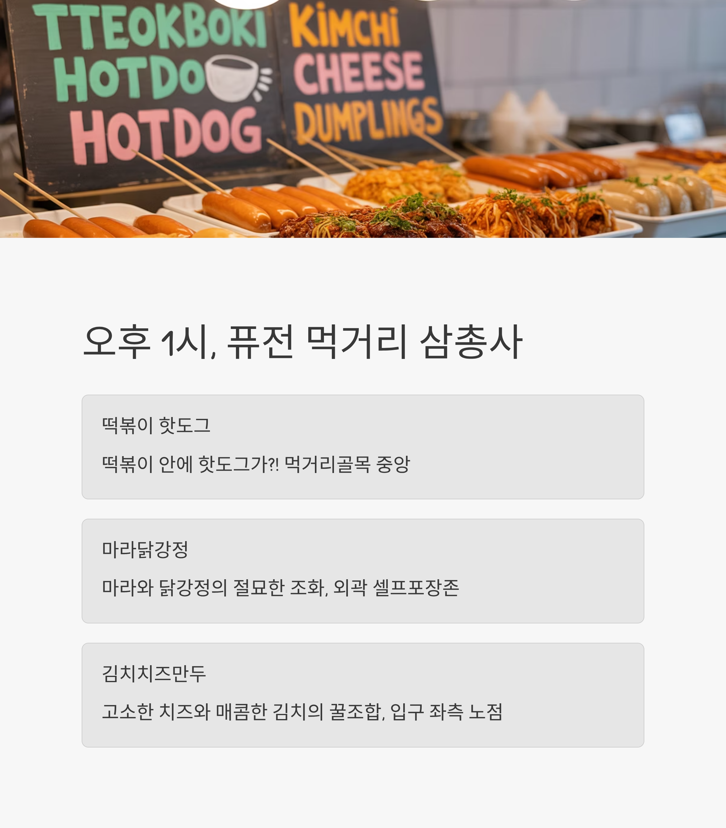 | 떡볶이 핫도그 | 떡볶이 안에 핫도그가?! | 먹거리골목 중앙 |