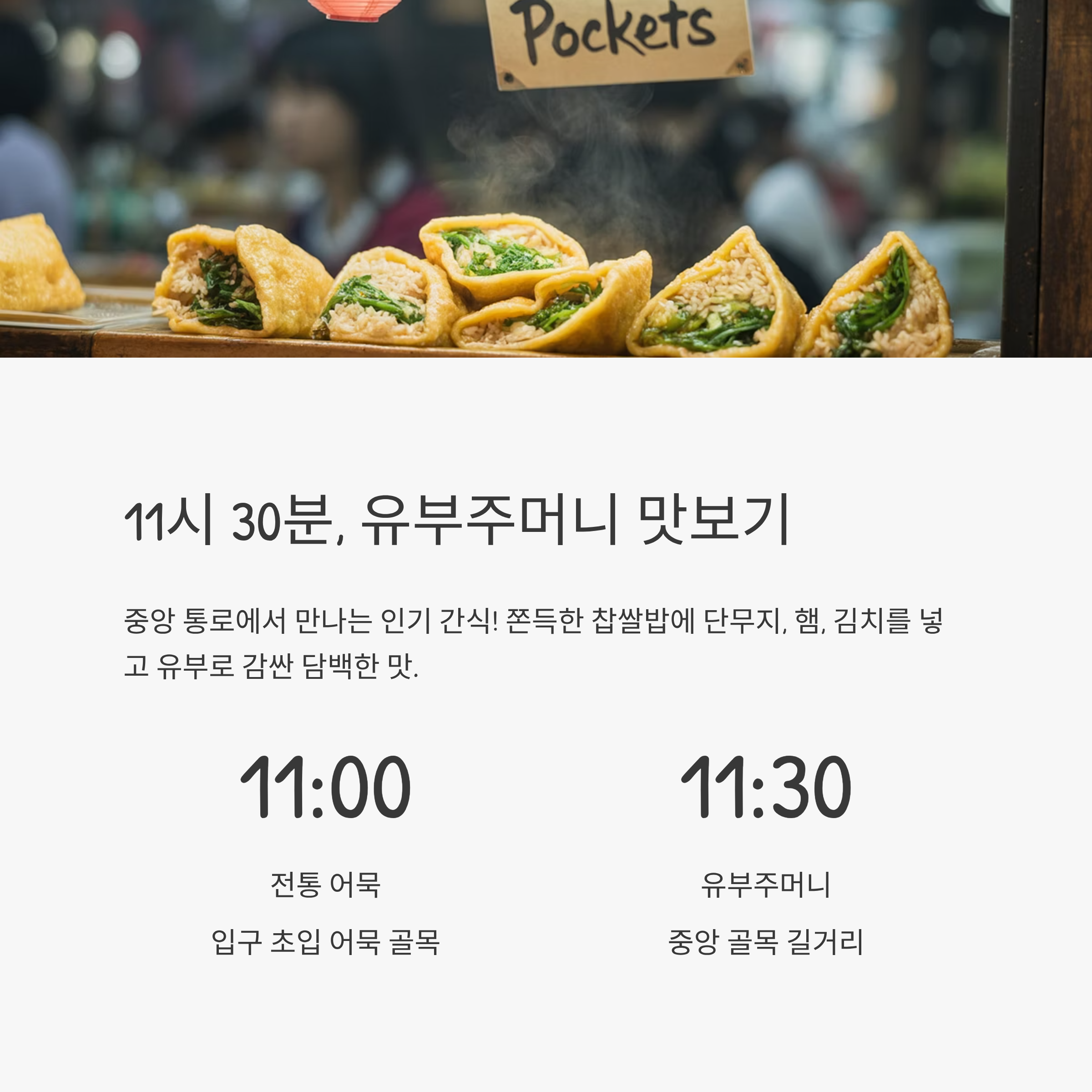 | 11:30 | 유부주머니 | 중앙 골목 길거리 |