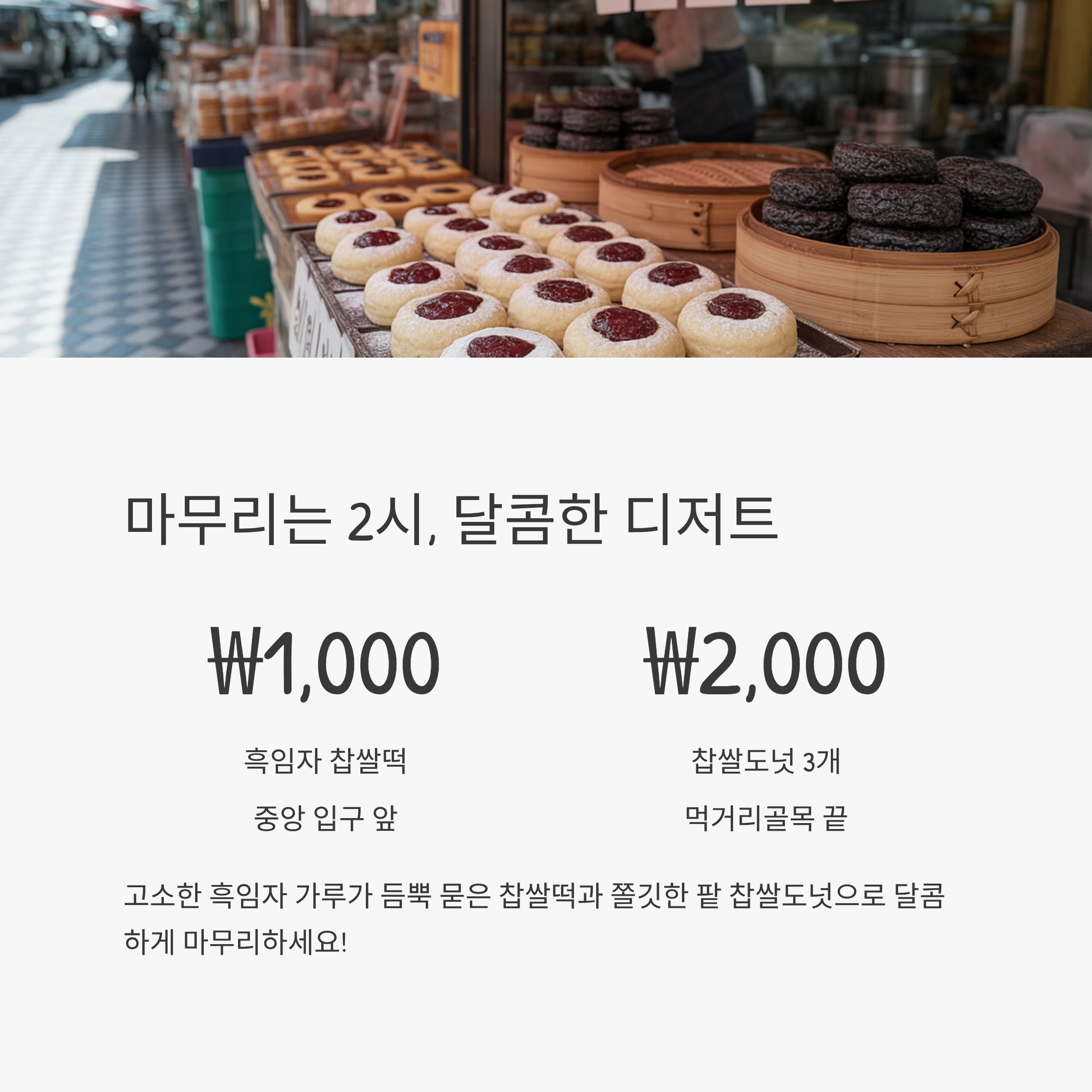 | 흑임자 찹쌀떡 | 개당 1,000원 내외 | 중앙 입구 앞 |