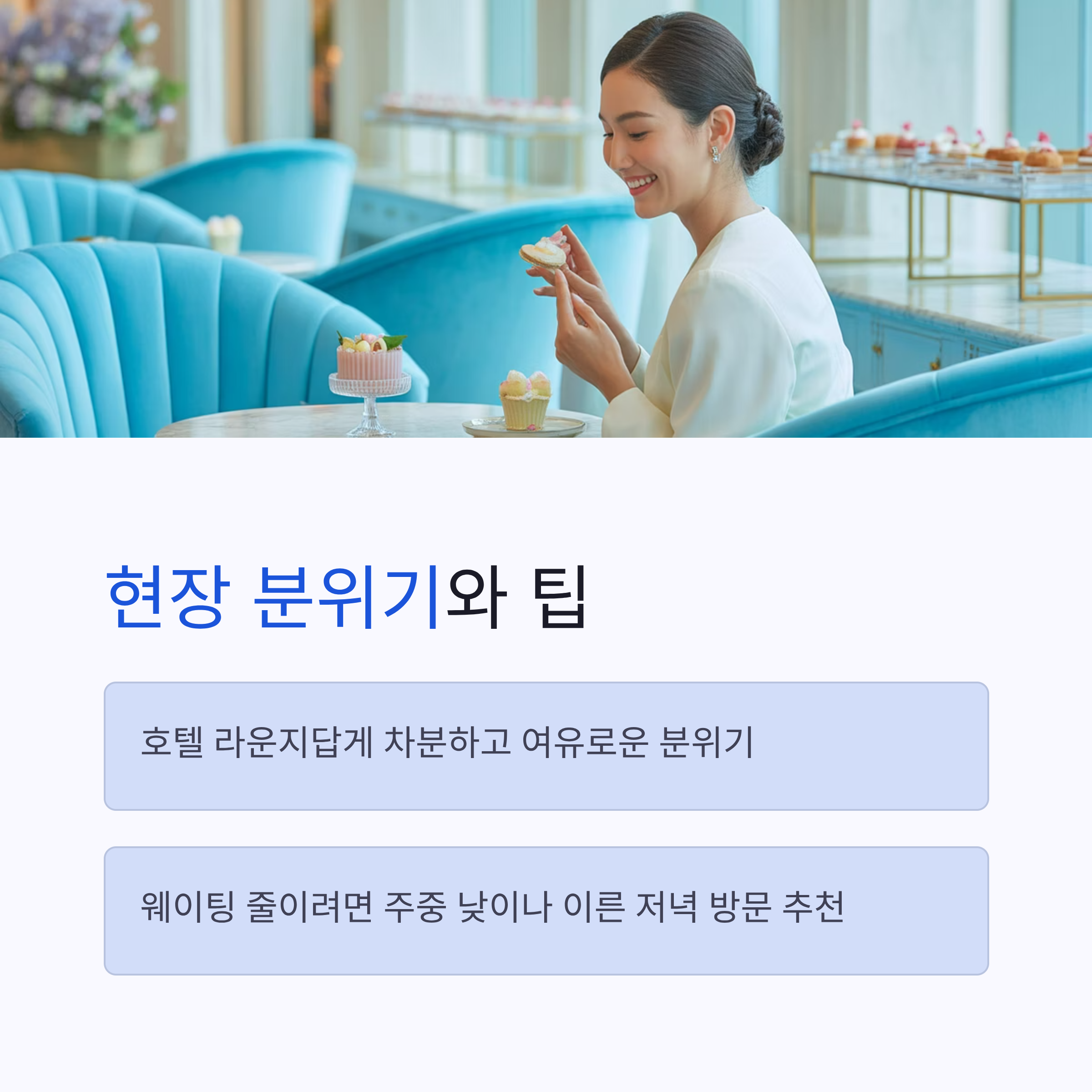 직접 가본 분들의 이야기를 보면, 공간 자체가 호텔 라운지답게 차분하고 여유로운 분위기라서 기다림조차 특별한 경험으로 느껴진다고 해요. 하지만 웨이팅을 줄이고 싶다면 주중 낮 시간이나 이른 저녁 시간을 노리는 게 좋아요.