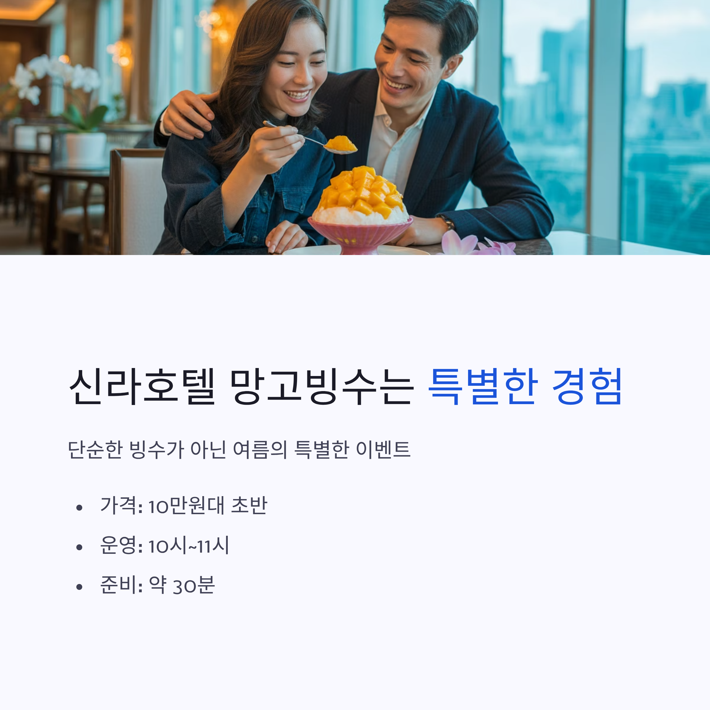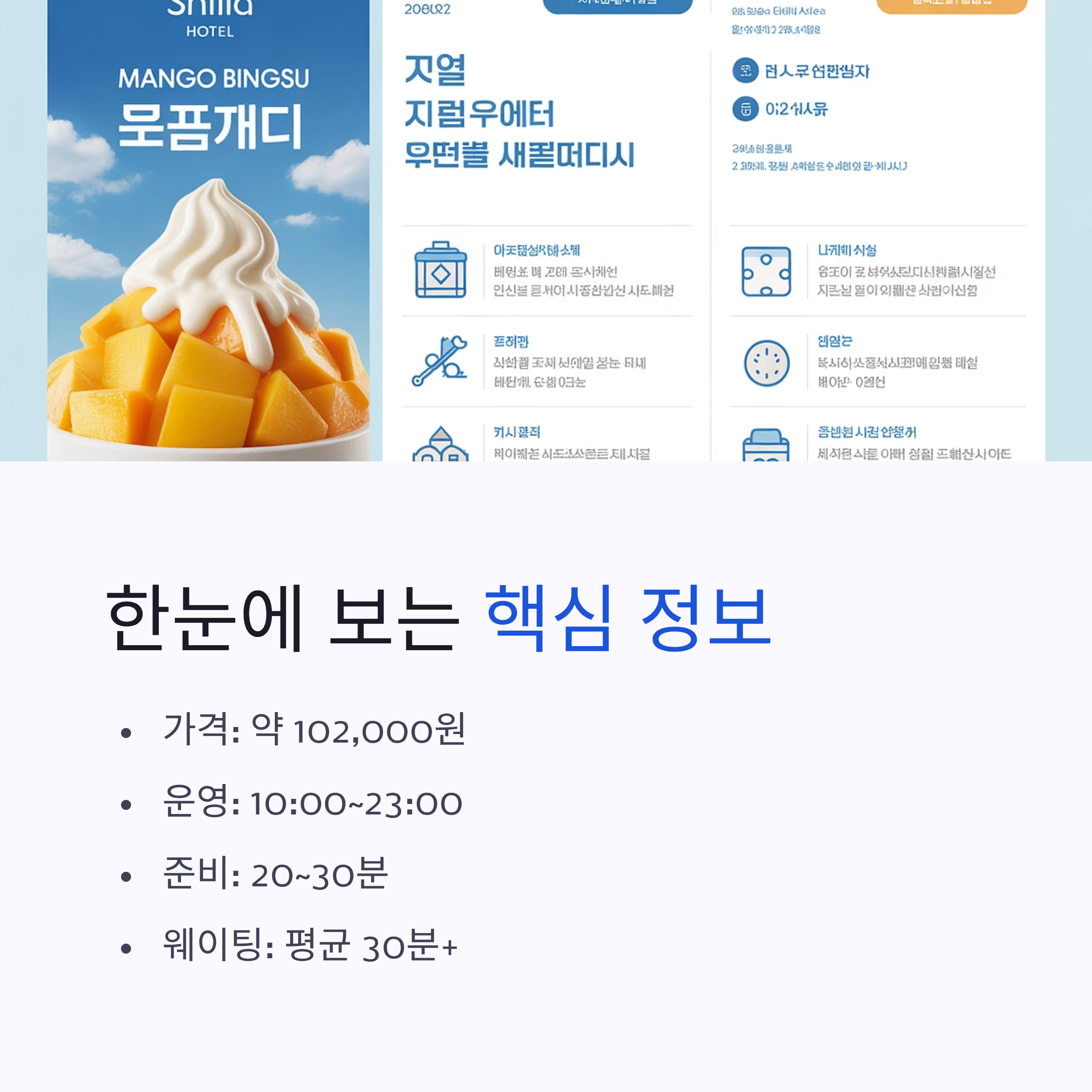 정리하자면 신라호텔 망고빙수는 가격은 10만 원대 초반, 운영 시간은 오전 10시부터 밤 11시까지, 준비 시간은 약 30분, 웨이팅은 시간대에 따라 다르지만 평균 30분 이상이라는 점이에요. 단순히 빙수라기보다는 ‘여름의 특별한 경험’을 즐기는 하나의 이벤트라고 보는 게 맞을 것 같아요.