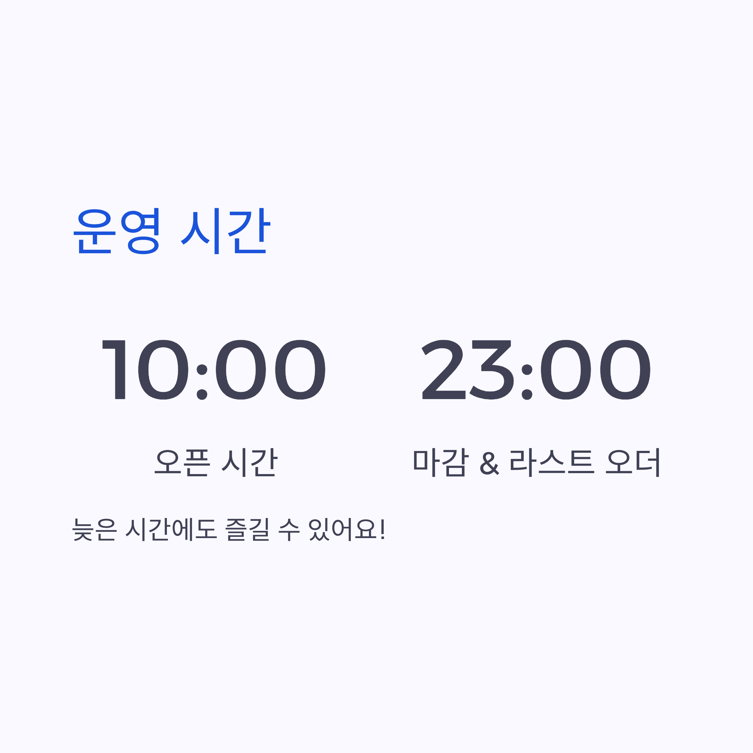 | 운영 시간 | 10:00 ~ 23:00, 라스트 오더 23:00 |