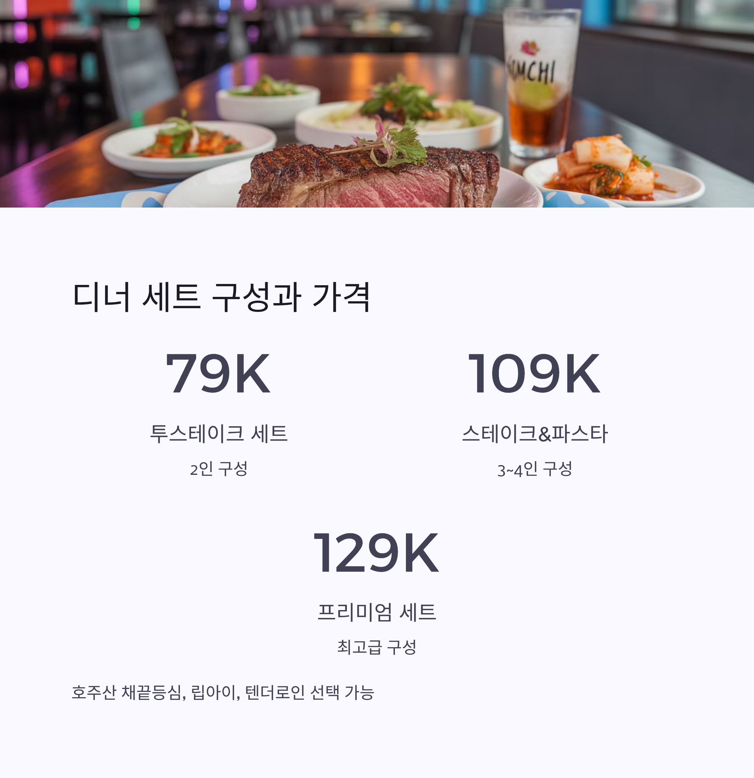 스테이크는 호주산 채끝등심, 립아이, 텐더로인 중 선택 가능하며, 애피타이저와 사이드 선택 옵션도 제공돼요.