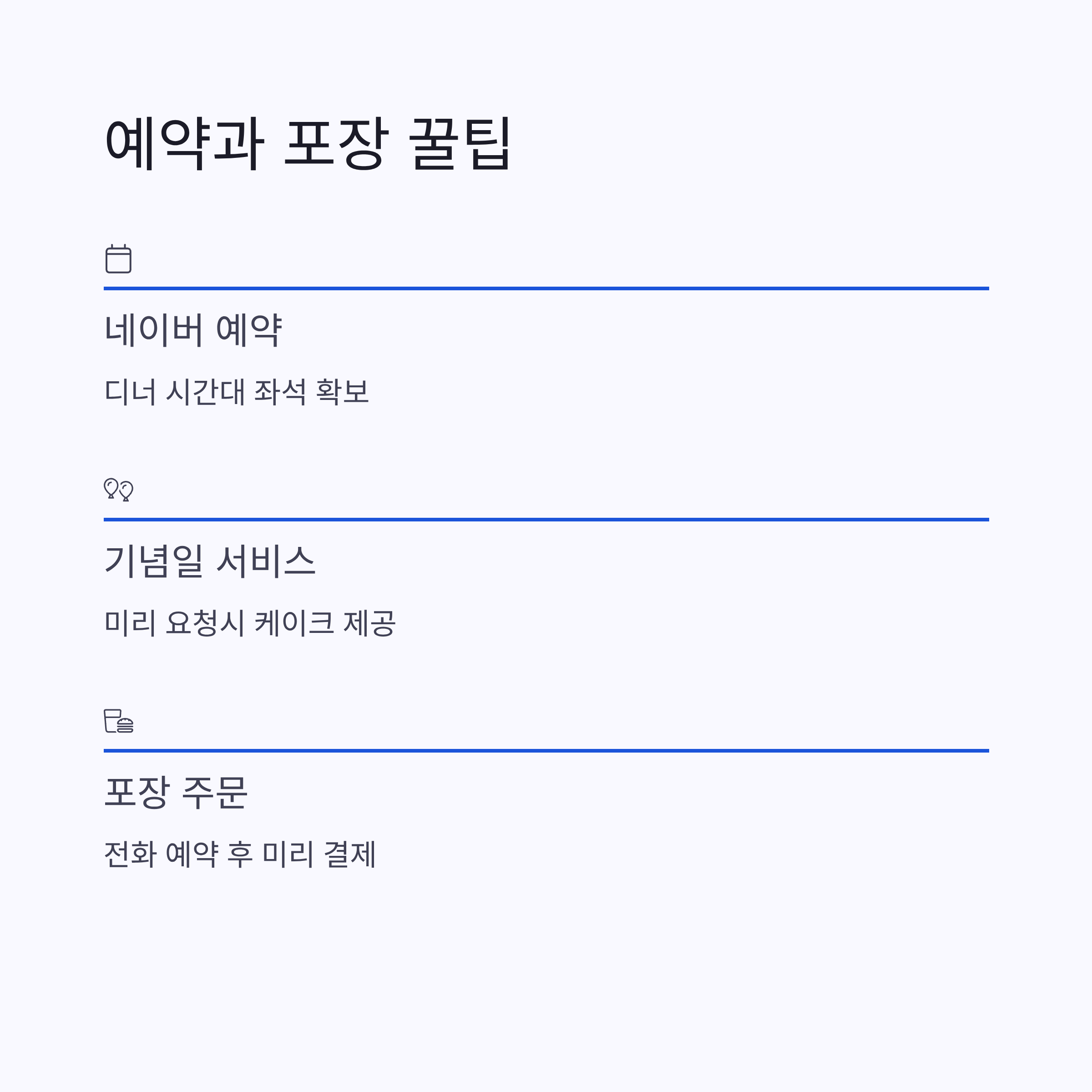 디너 시간대에는 네이버 예약을 통해 좌석 확보가 가능하며, 생일이나 기념일인 경우 미리 요청하면 간단한 케이크 서비스도 가능해요.