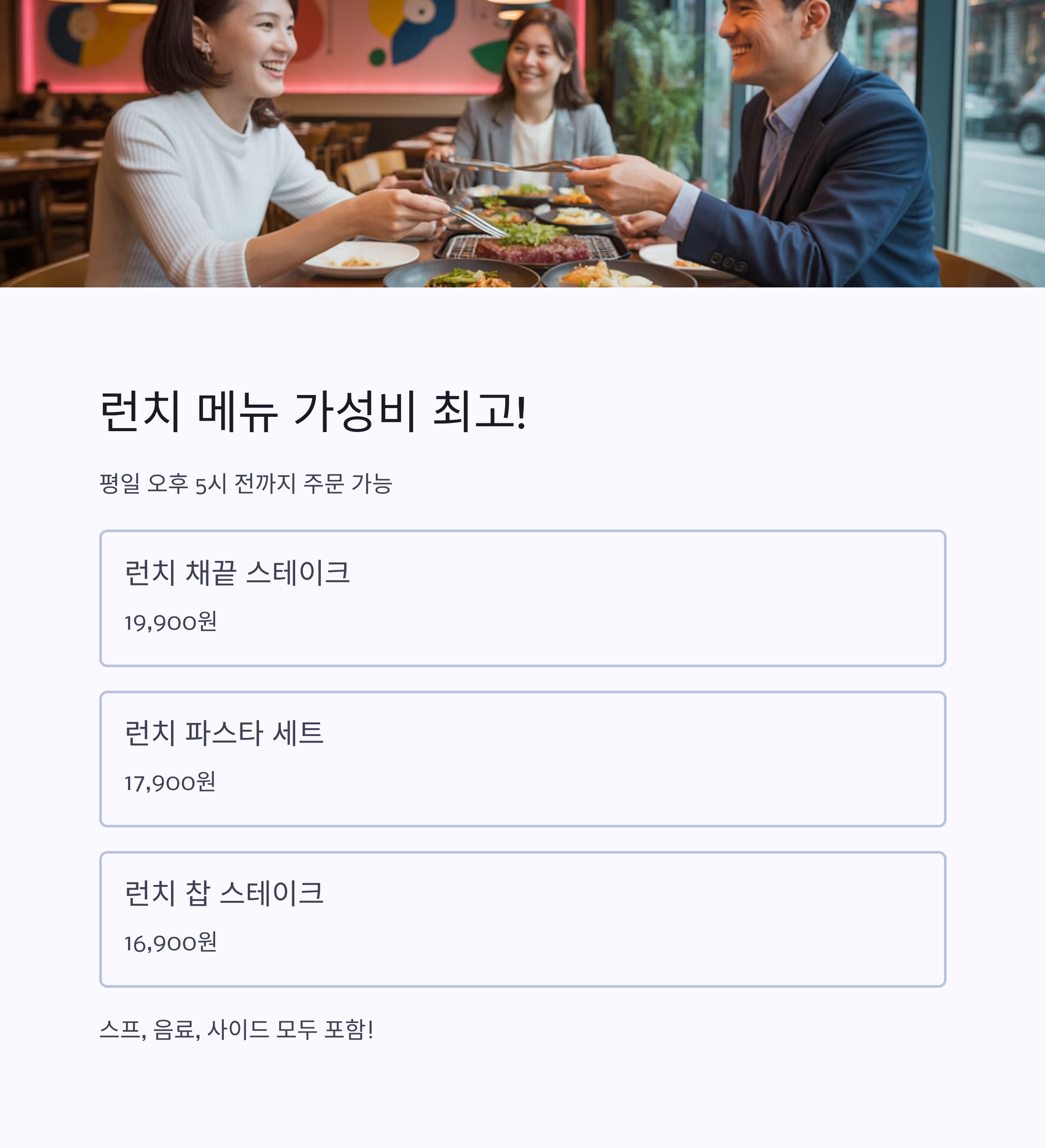 모든 런치 세트에는 수프, 음료, 사이드(샐러드 또는 감자요리)까지 포함되어 있어 구성도 알찹니다.