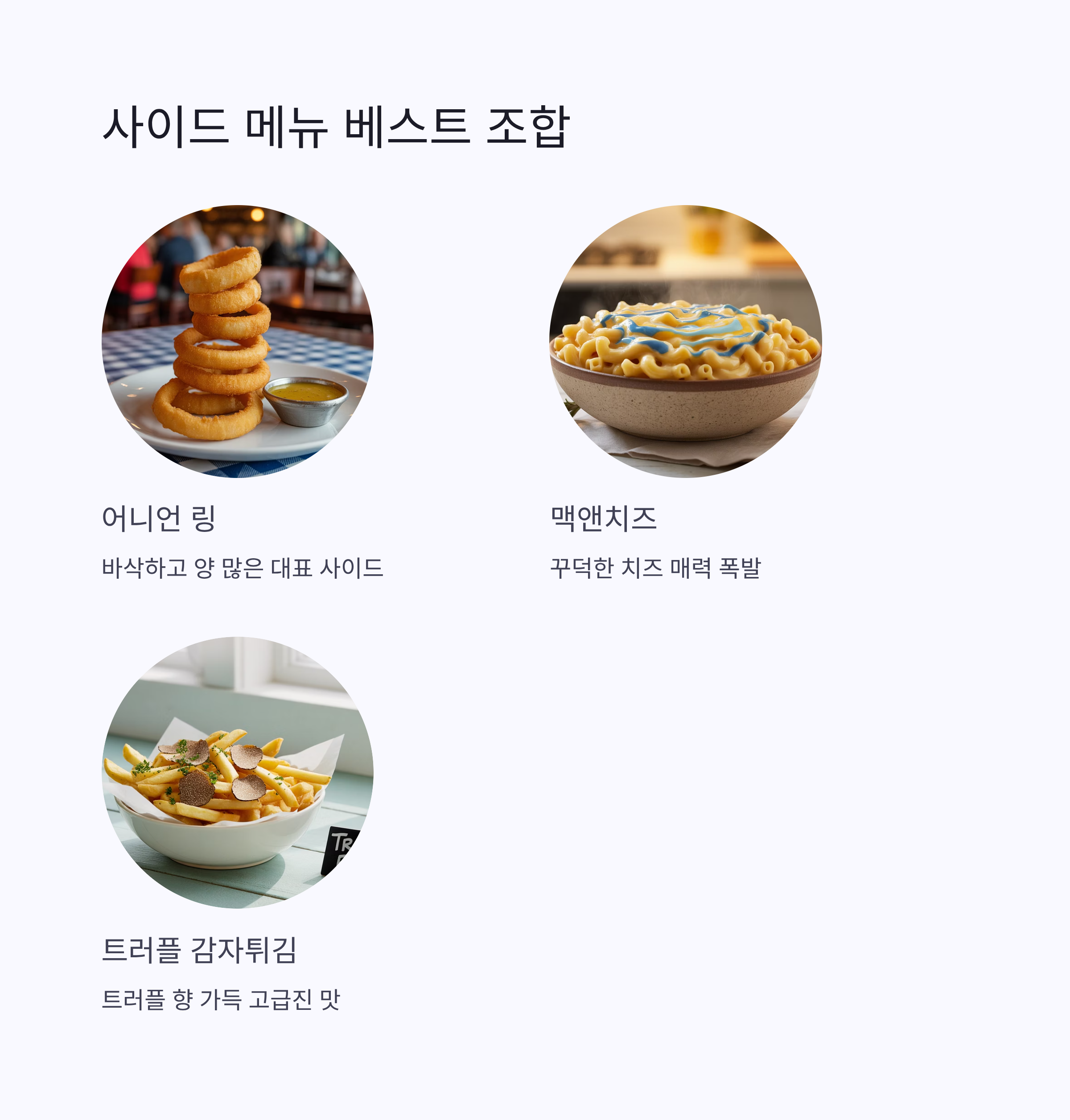 스테이크와 찰떡궁합인 사이드 메뉴도 함께 즐기면 만족도가 확 올라가요. 특히 아래 메뉴는 인기 많아요.