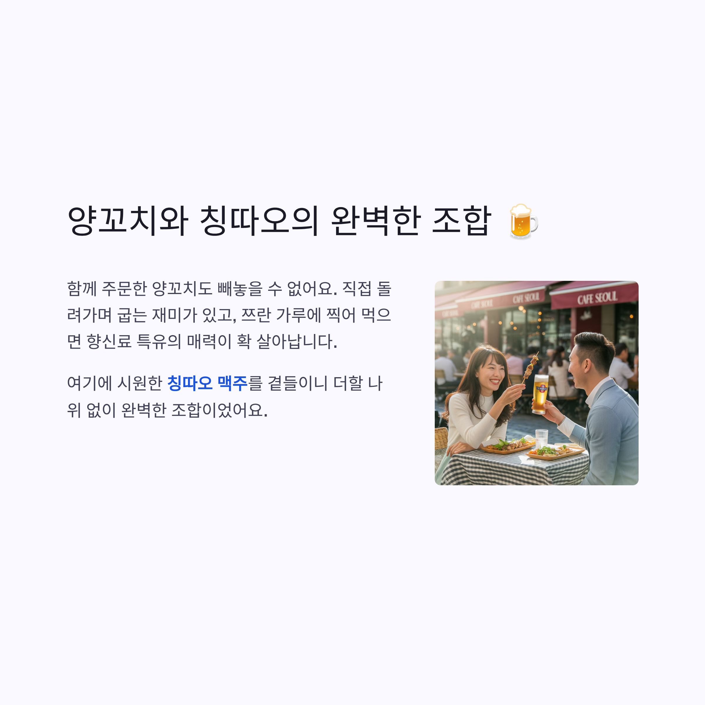 함께 주문한 양꼬치도 빼놓을 수 없어요. 직접 돌려가며 굽는 재미가 있고, 쯔란 가루에 찍어 먹으면 향신료 특유의 매력이 확 살아납니다. 여기에 시원한 칭다오 맥주를 곁들이니 더할 나위 없이 완벽한 조합이었어요.