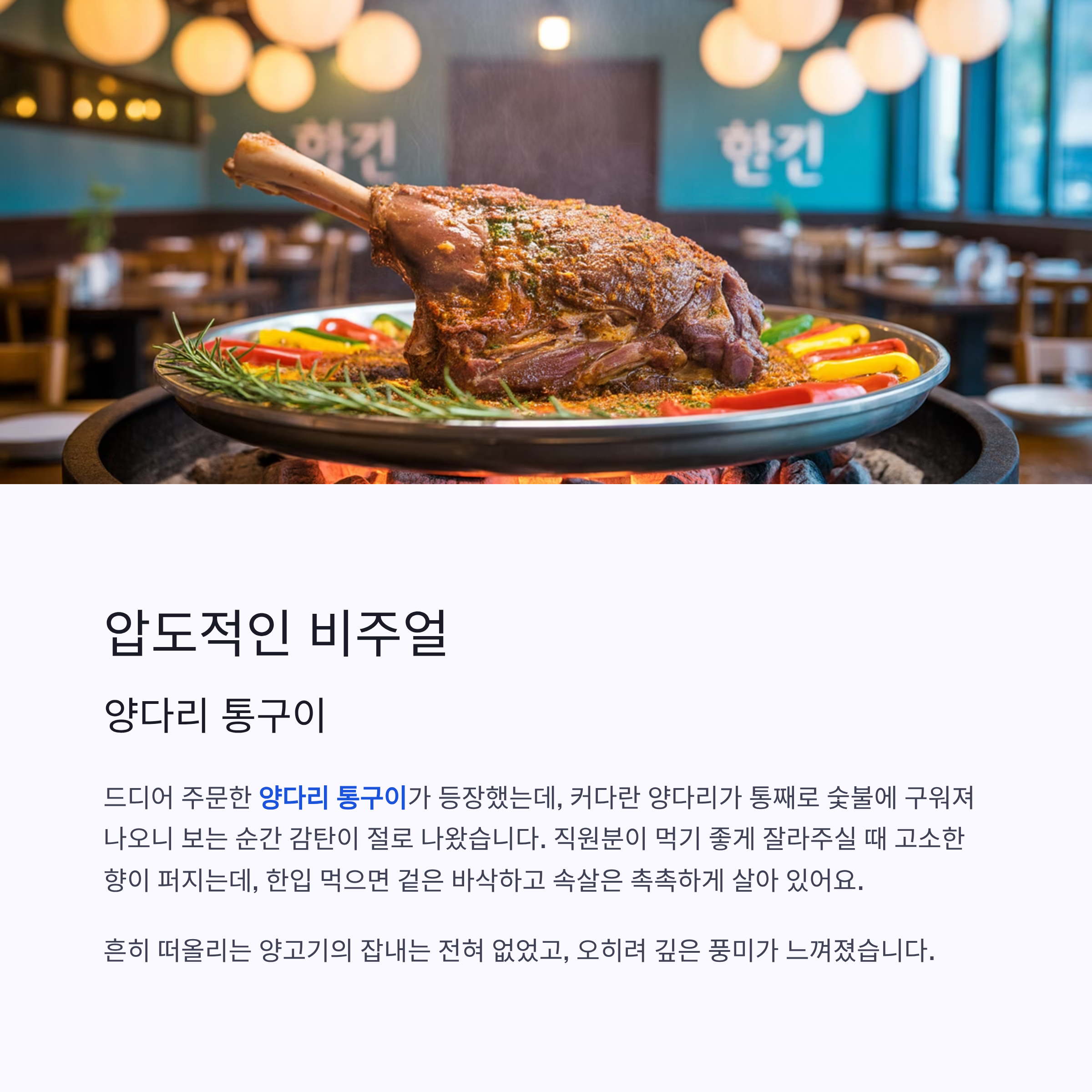 드디어 주문한 양다리 통구이가 등장했는데, 커다란 양다리가 통째로 숯불에 구워져 나오니 보는 순간 감탄이 절로 나왔습니다. 직원분이 먹기 좋게 잘라주실 때 고소한 향이 퍼지는데, 한입 먹으면 겉은 바삭하고 속살은 촉촉하게 살아 있어요. 흔히 떠올리는 양고기의 잡내는 전혀 없었고, 오히려 깊은 풍미가 느껴졌습니다.