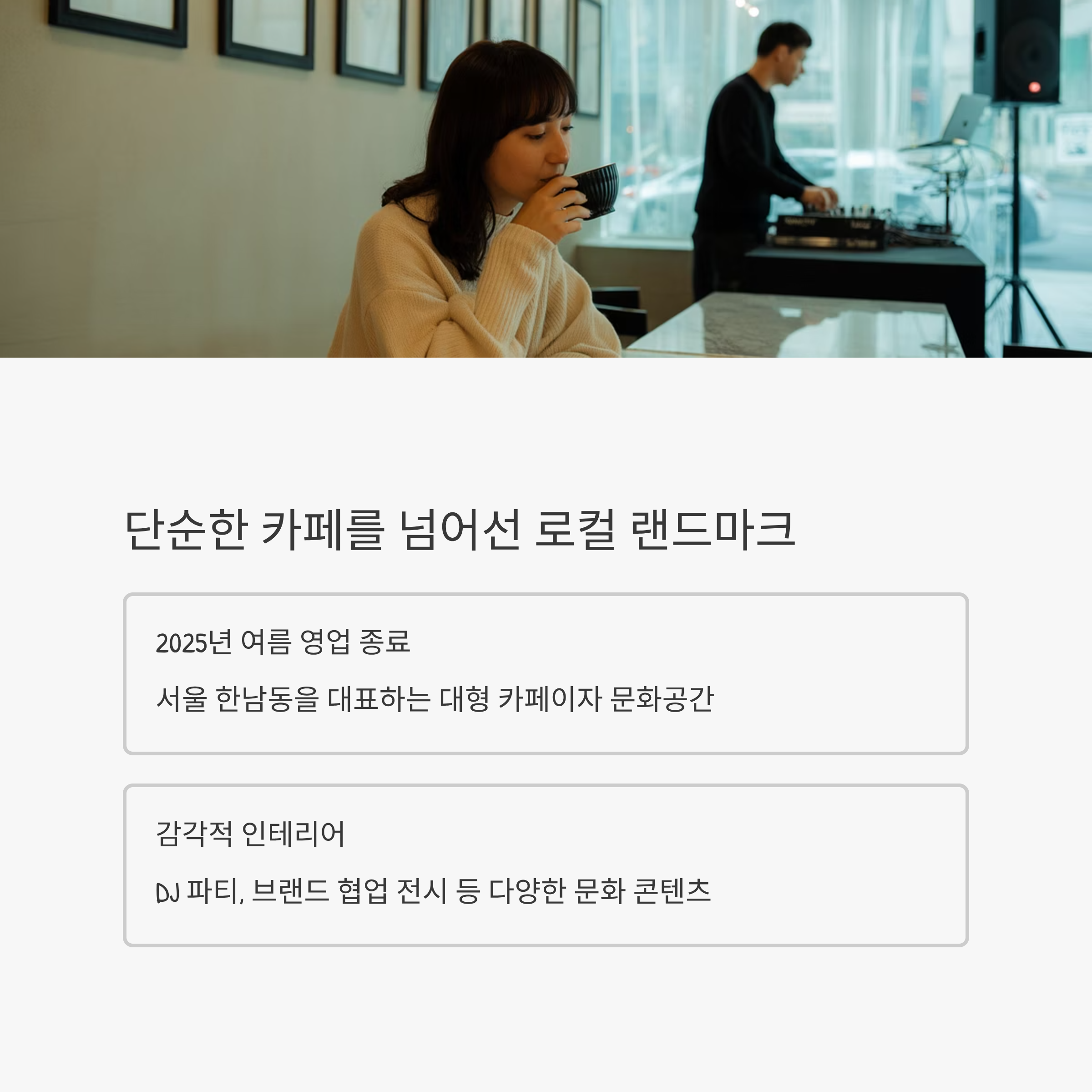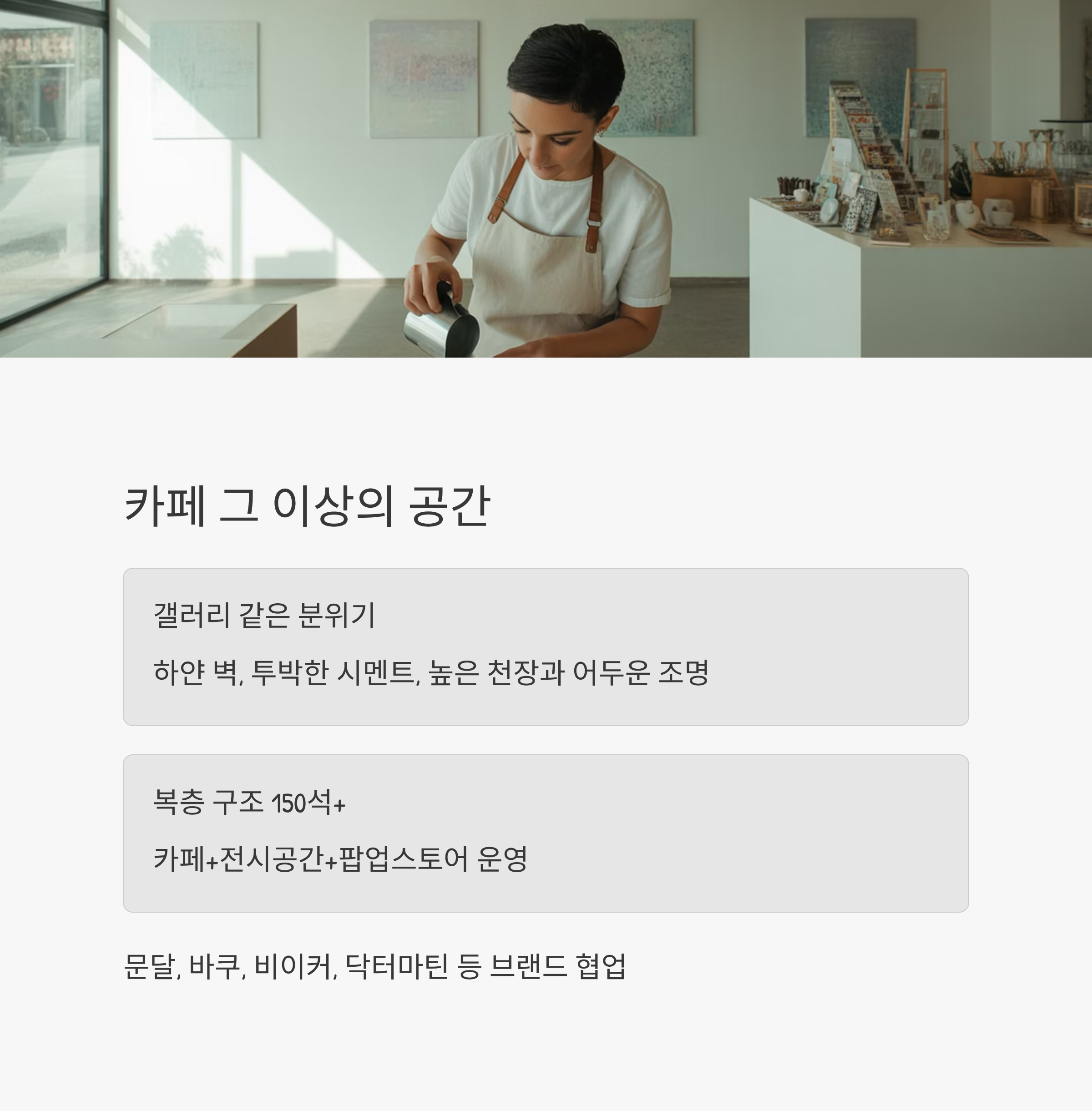 | 특징 | 카페 + 전시공간 + 팝업스토어 운영 |