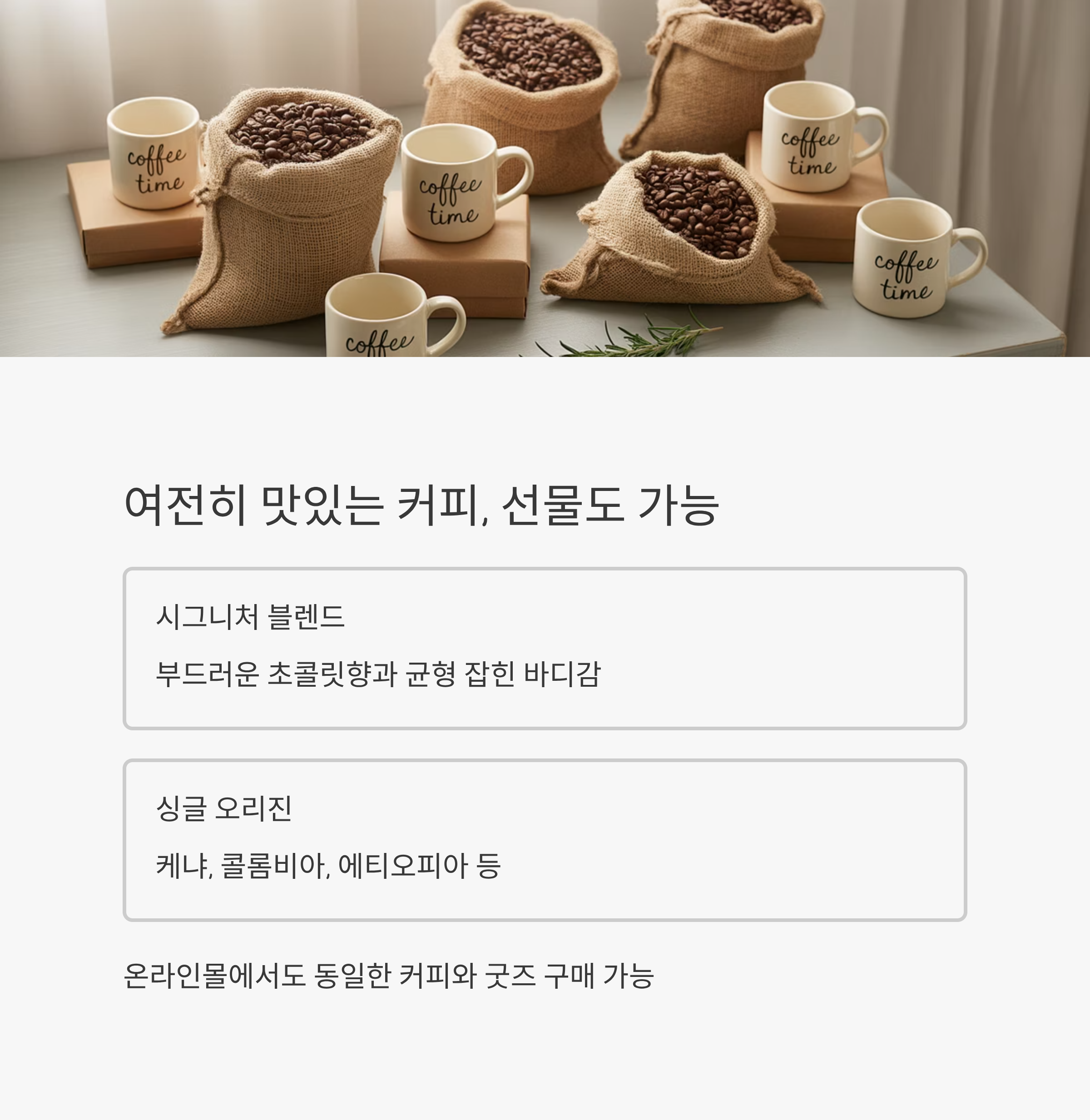 | 굿즈 | 한정판 텀블러, 원두 판매 |