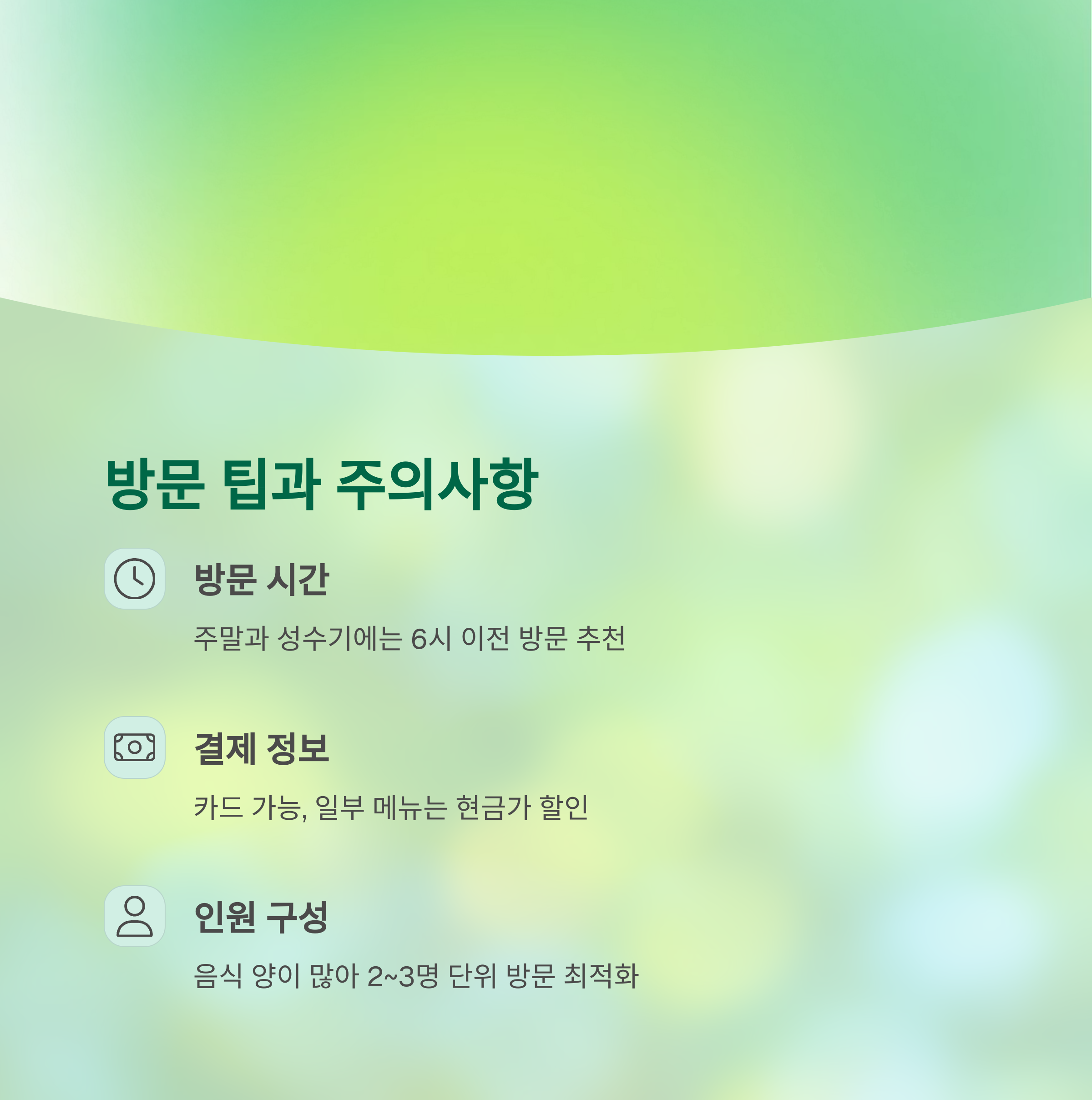 • 음식은 양이 많아 2~3명 단위 방문에 최적화