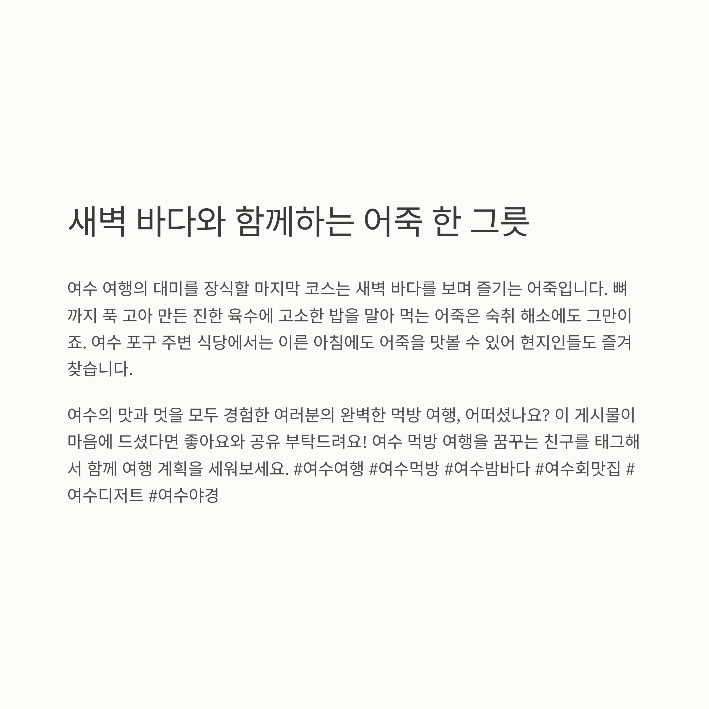 여수는 아름다운 밤바다와 함께 다양한 해산물 요리, 맛있는 간식, 그리고 감성 넘치는 디저트까지 모두 즐길 수 있는 완벽한 먹방 여행지입니다. 이 글에서는 여수 밤바다를 배경으로 시작부터 후식까지 완벽하게 즐길 수 있는 코스를 소개해 드리겠습니다. 가족, 연인, 친구 누구와 함께해도 만족할 수 있는 여수 먹방 여행을 계획해 보세요.
