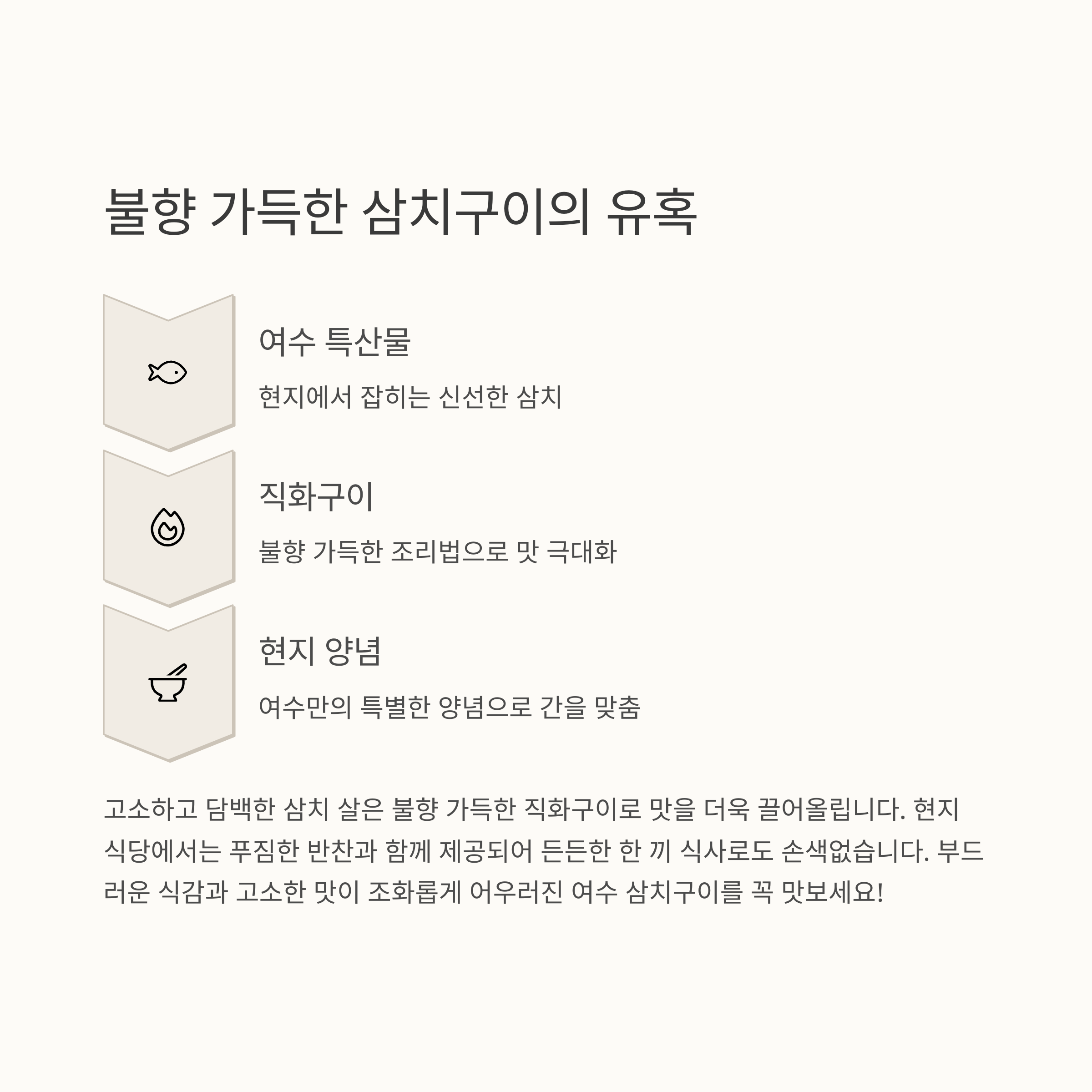 삼치구이는 현지 식당에서 밥반찬으로도 인기가 많아 푸짐한 한상차림으로도 추천됩니다. 특히 여수 현지 양념으로 간을 맞춘 삼치구이는 부드럽고 고소한 맛이 일품입니다.