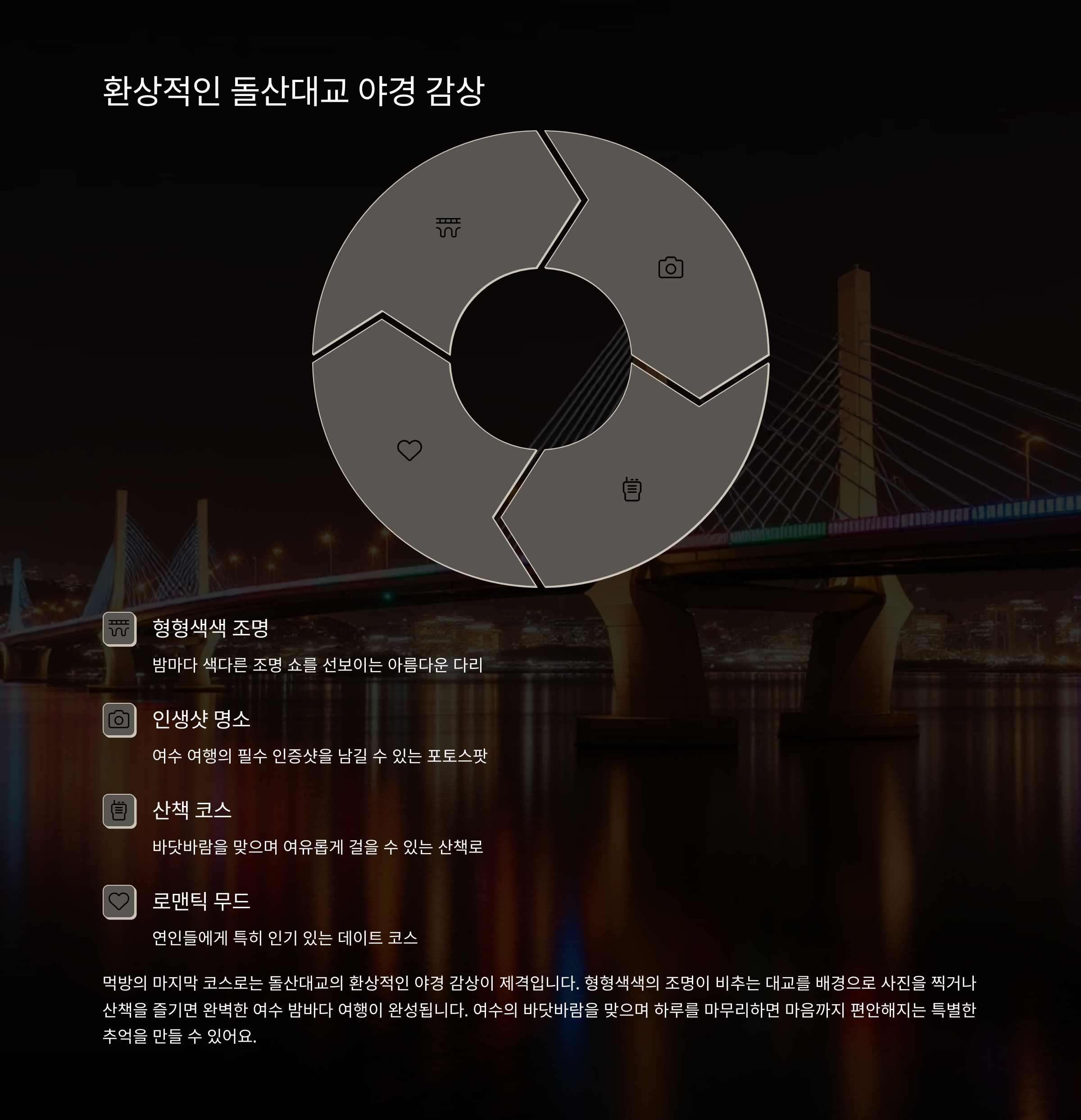 형형색색의 조명이 비추는 대교를 배경으로 사진을 찍거나 산책을 즐기면 완벽한 여수 밤바다 여행이 완성됩니다.