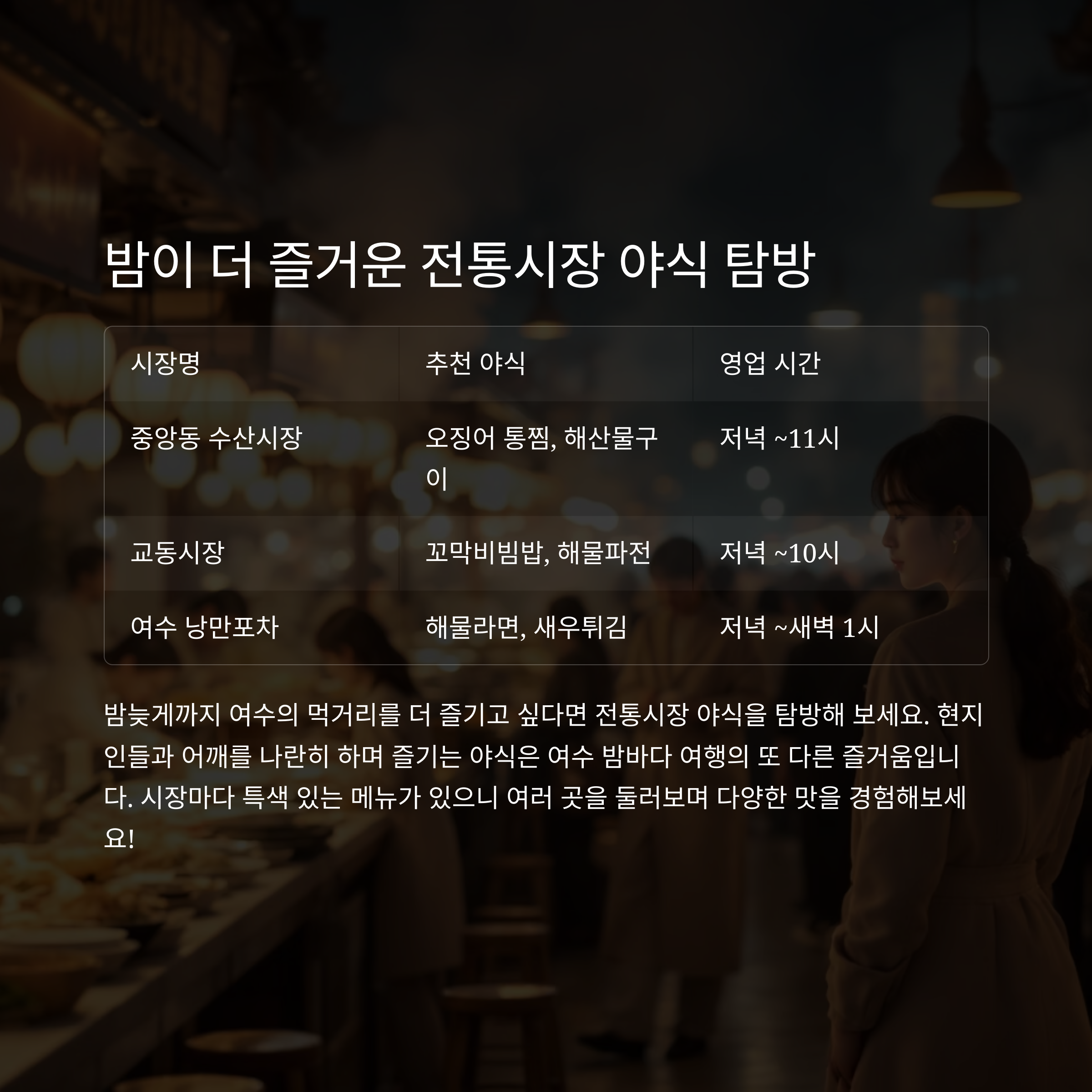 밤늦게까지 여수의 먹거리를 더 즐기고 싶다면 전통시장 야식을 탐방해 보세요.