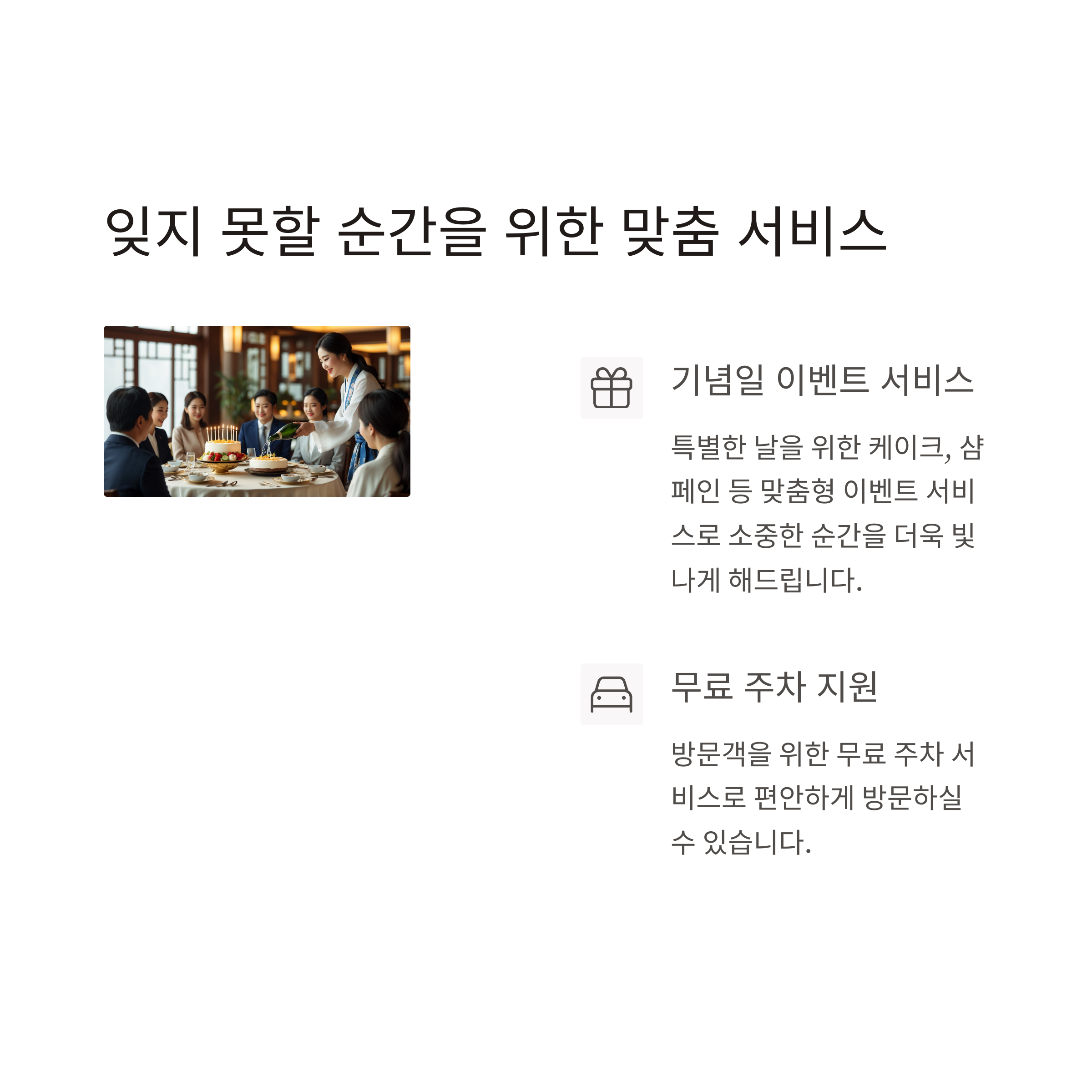 상견례 외에도 결혼기념일과 같은 특별한 날에 일상을 벗어나는 멋진 시간을 보낼 수 있게 분위기가 세심하게 조성됩니다.