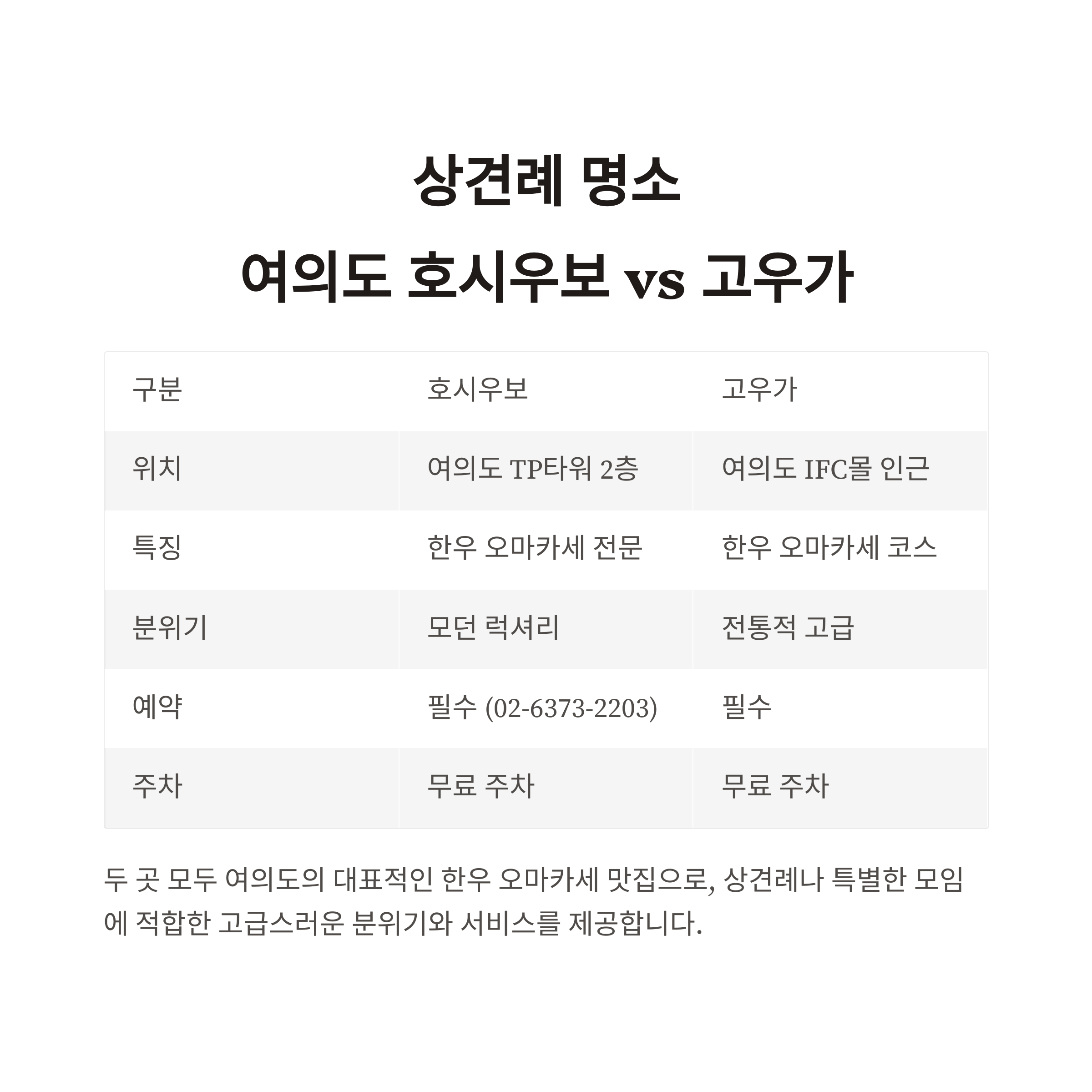 결론적으로, 두 식당 모두 여의도의 대표 상견례 장소로서 훌륭한 옵션임을 기억하세요.