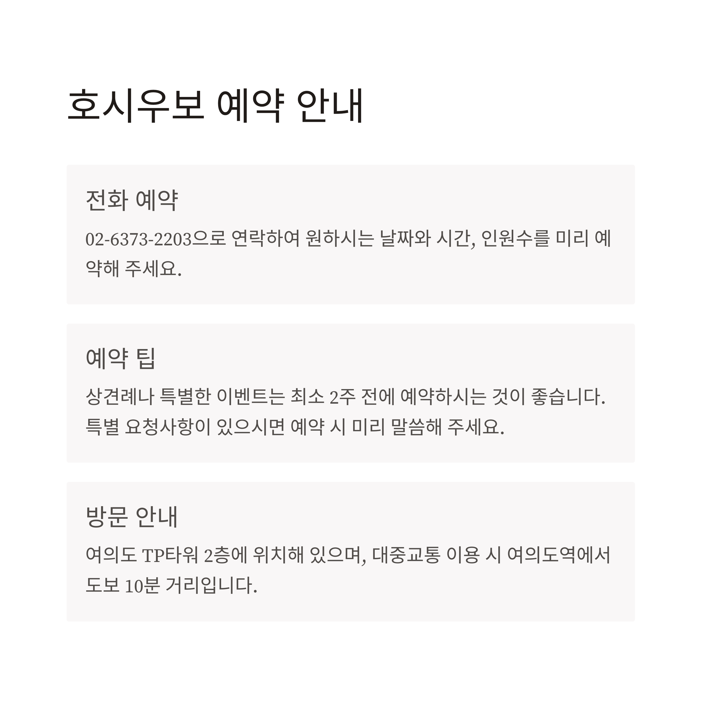 | 호시우보 위치 | 서울 영등포구 의사당대로 96 TP타워 2층 |