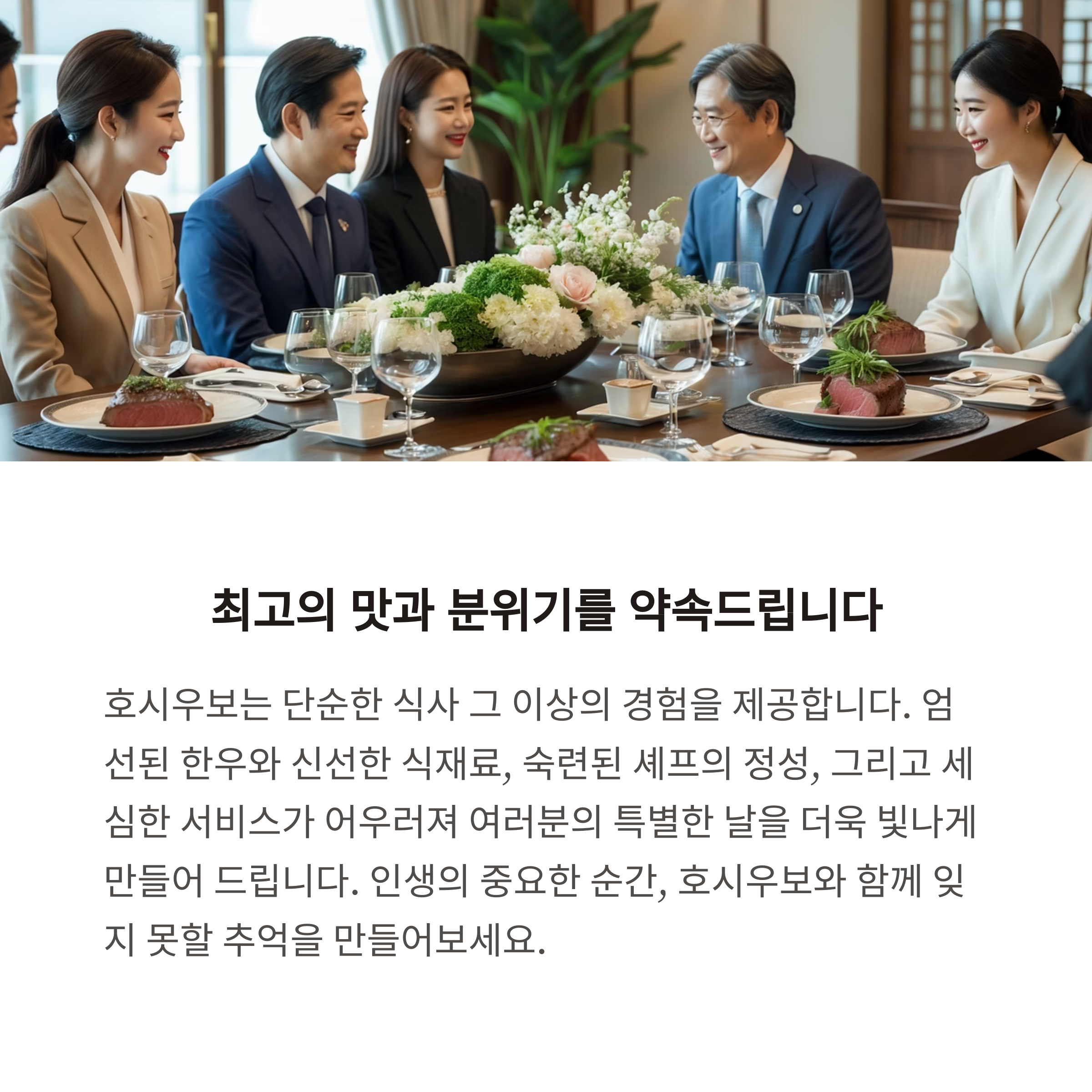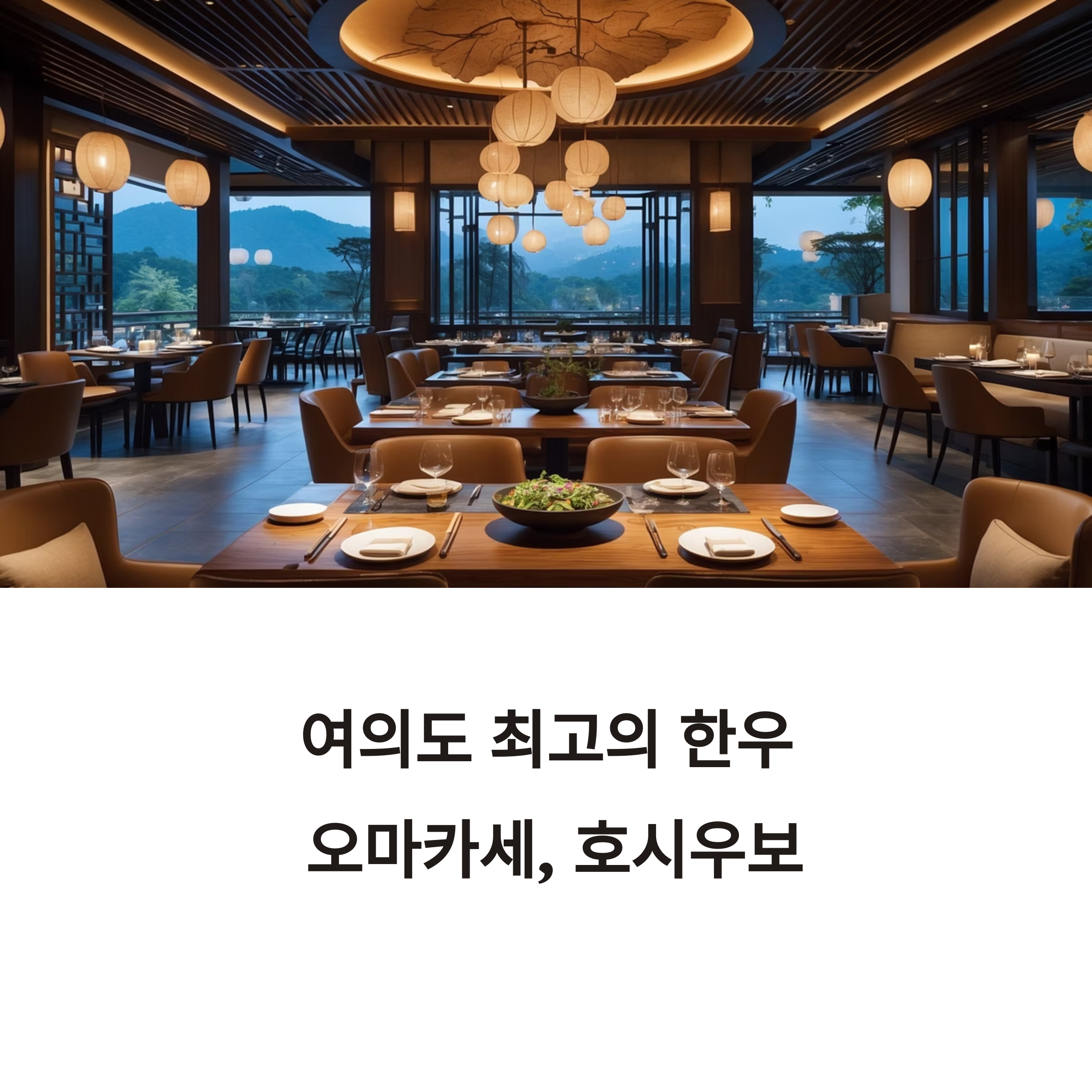 호시우보는 여의도에서 가장 주목받는 한우 오마카세 식당으로, 상견례와 같은 공식적인 자리에도 어울리는 고급스러운 분위기를 제공합니다. 이곳은 특유의 풀 코스 메뉴에 다양한 한우 특수 부위와 고급 재료를 독특하게 조화시킨 것이 특징입니다.