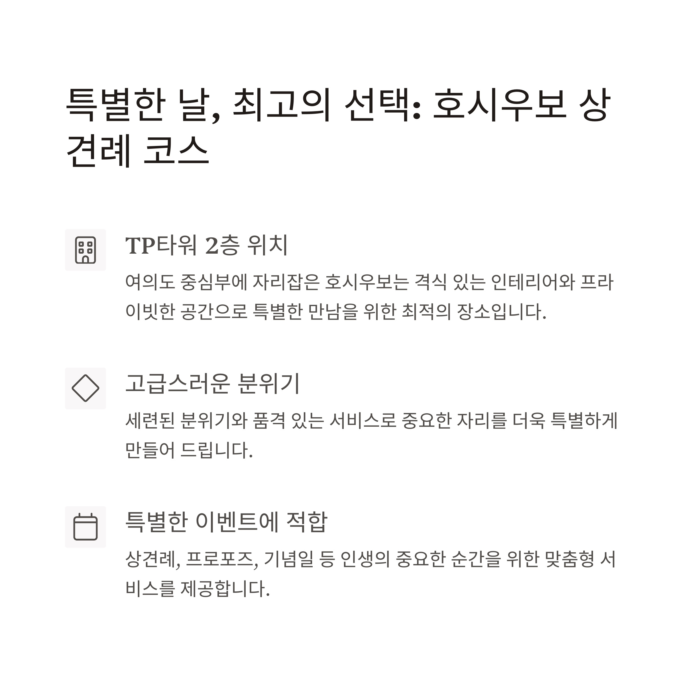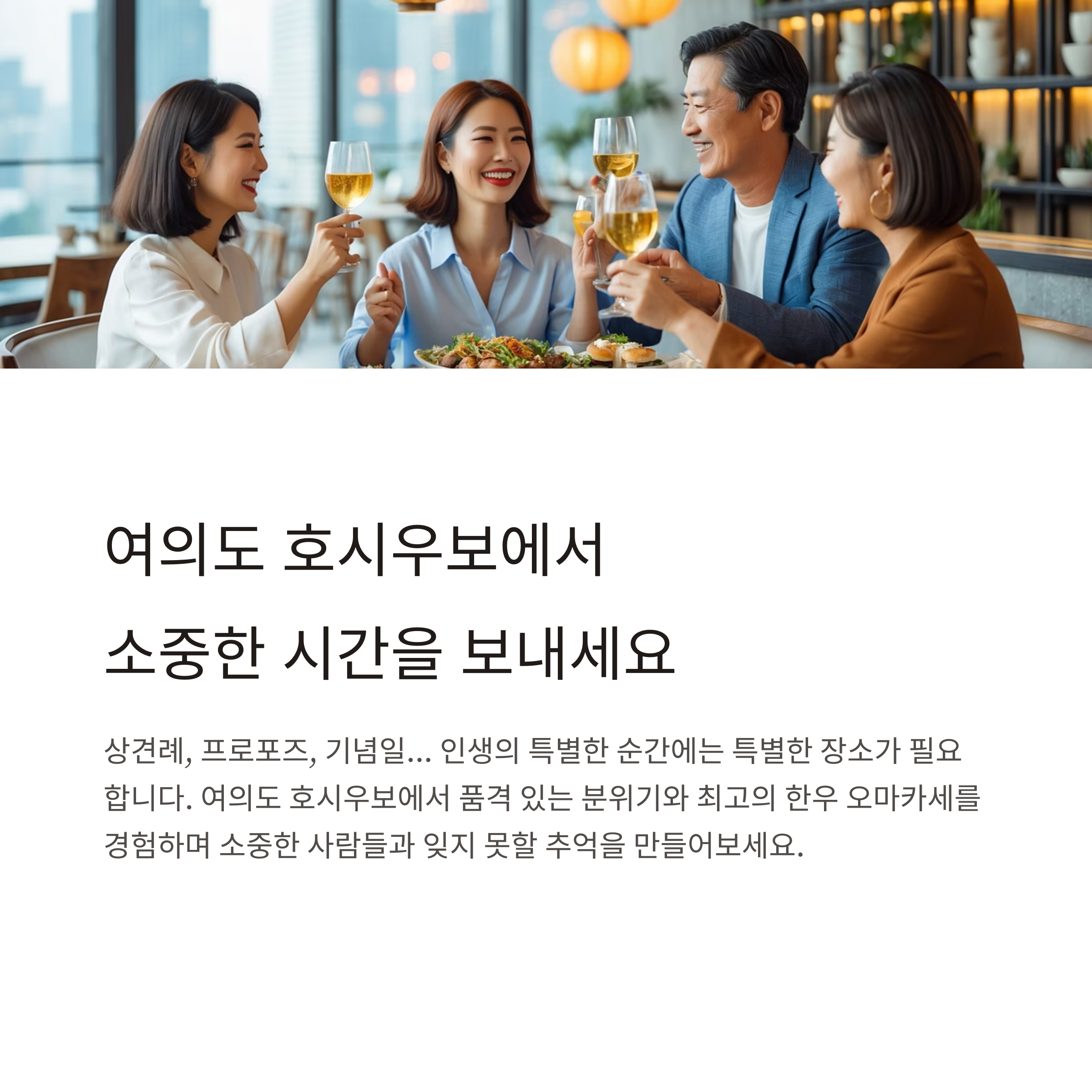 여의도의 상견례는 식장 및 메뉴 선택이 중요한 요소로, 고객의 선호에 따라 호시우보와 고우가에서 고를 수 있습니다.