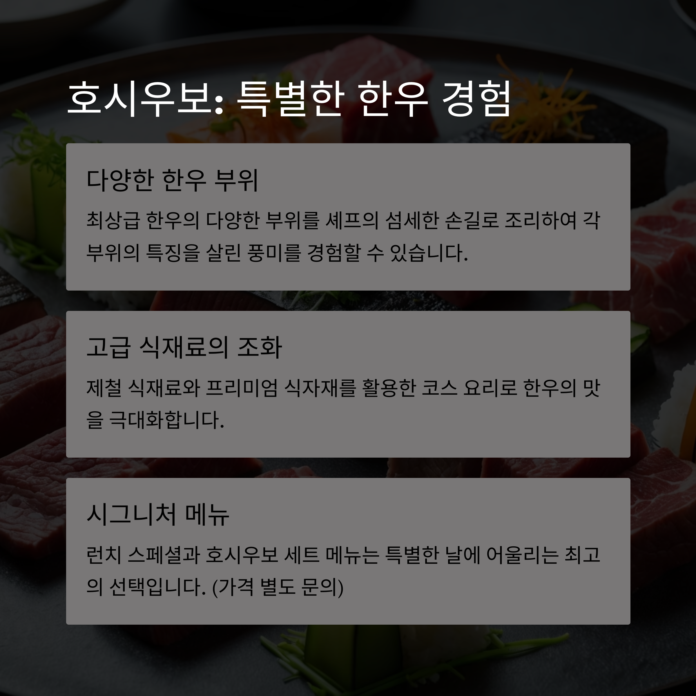 호시우보는 다양한 한우 특수 부위와 창의적인 요리를 포함한 오마카세로 상견례의 격을 높여줍니다.
