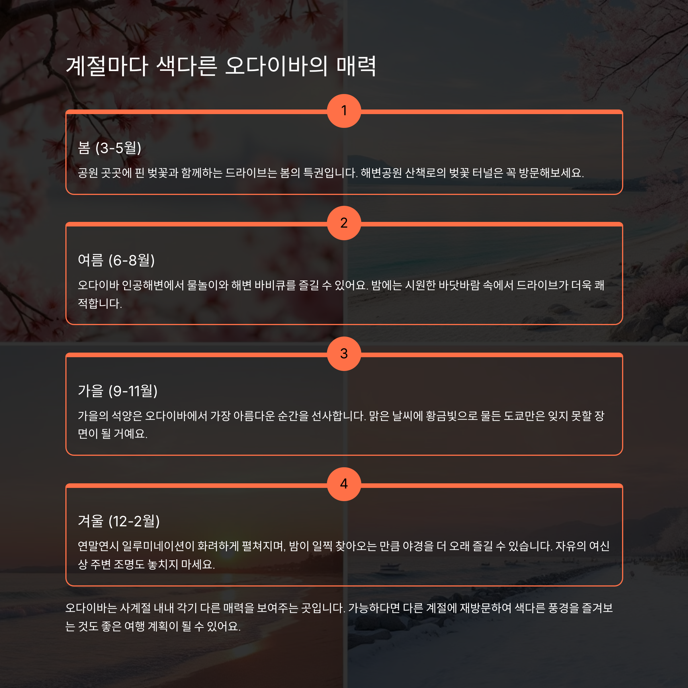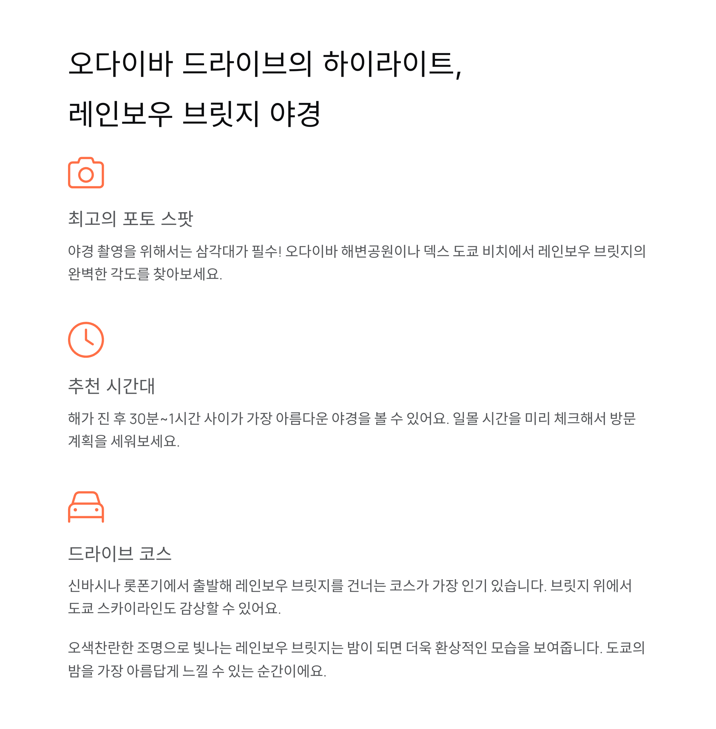 이 글에서는 오다이바 해변공원을 중심으로 한 드라이브 코스, 포토존, 야경 포인트 등