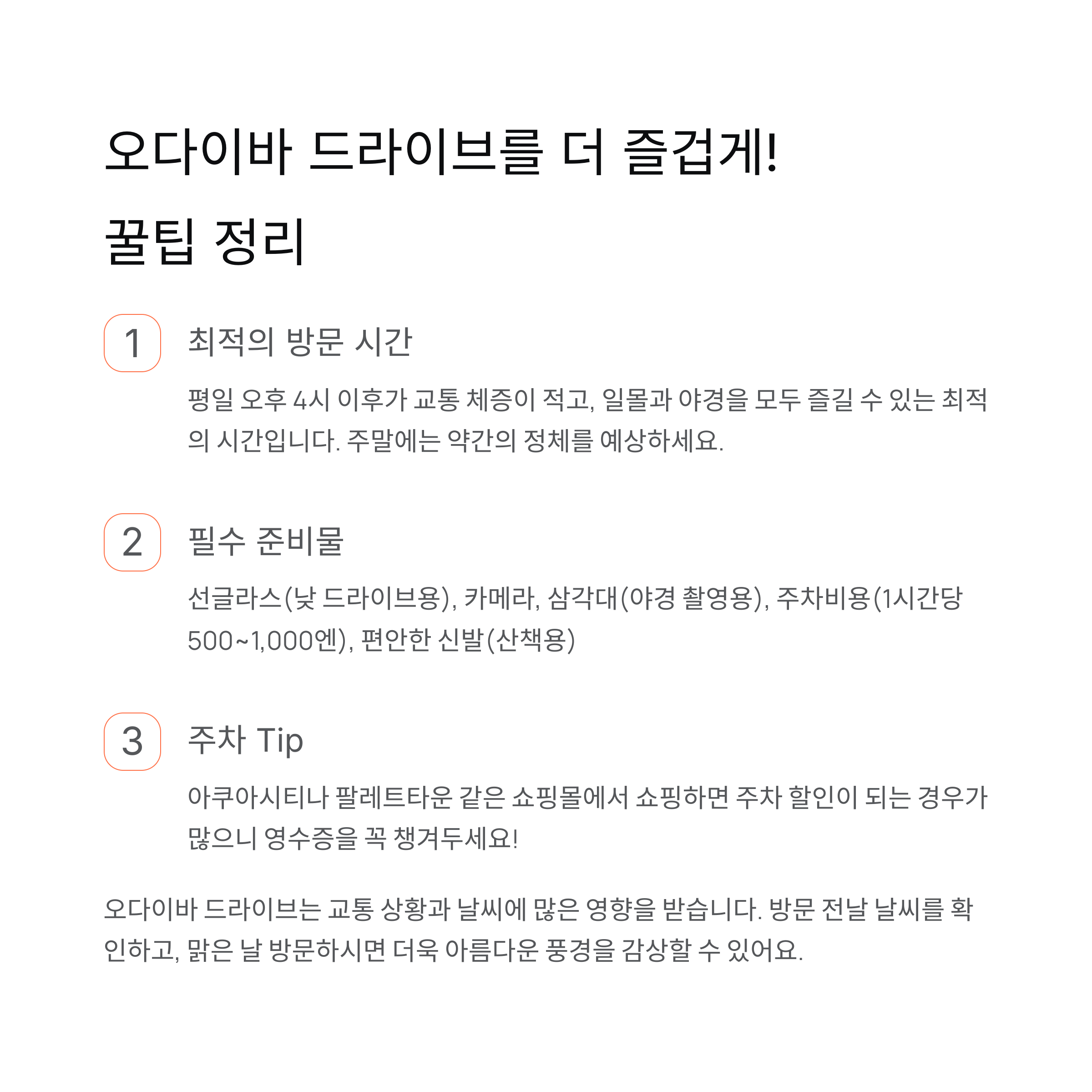 | 교통 팁 | 네비 설정 시 ‘오다이바 해변공원 주차장’ 검색 |