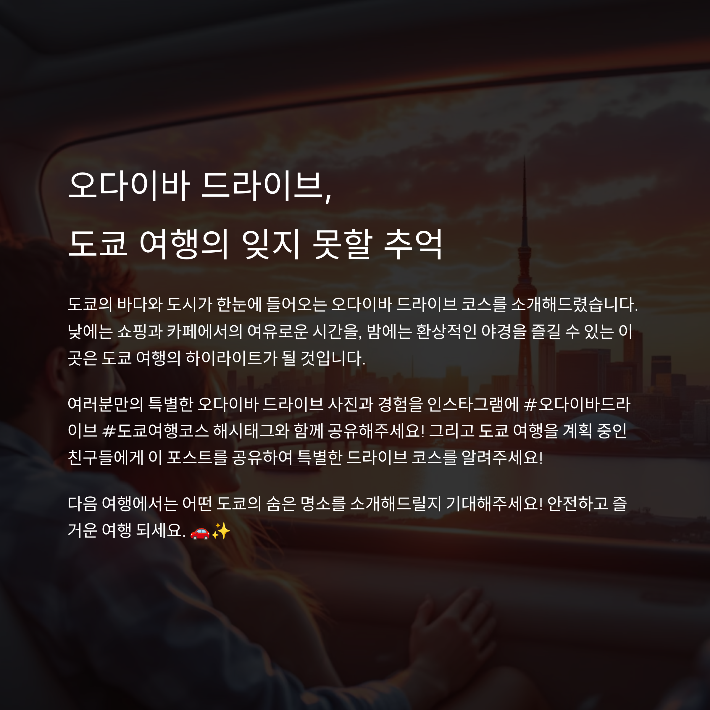 이 글에서는 오다이바 해변공원을 중심으로 한 드라이브 코스, 포토존, 야경 포인트 등