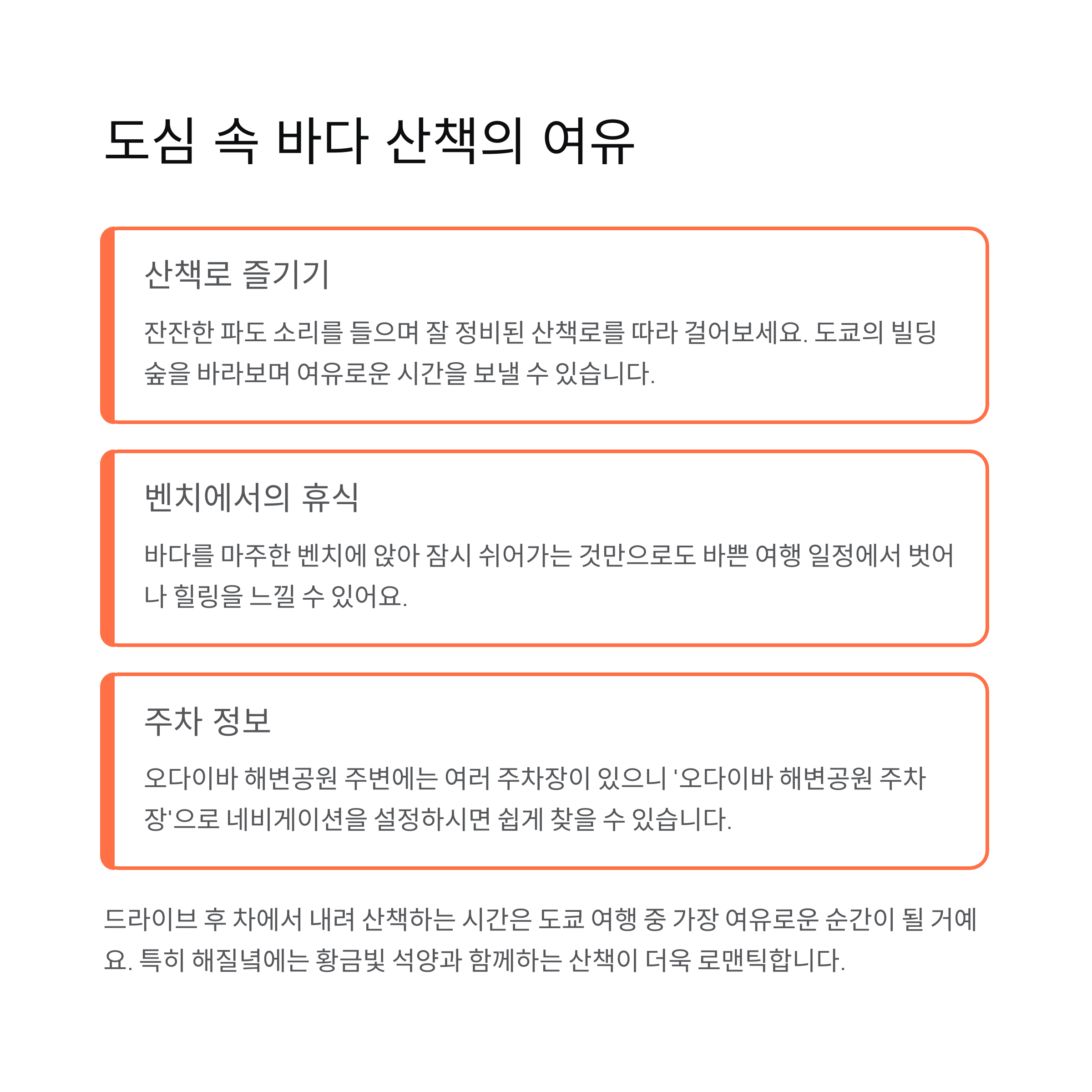 도쿄 속 특별한 해안 드라이브 코스를 찾고 계신가요? 오다이바 해변공원은 바다와 도시가 어우러진