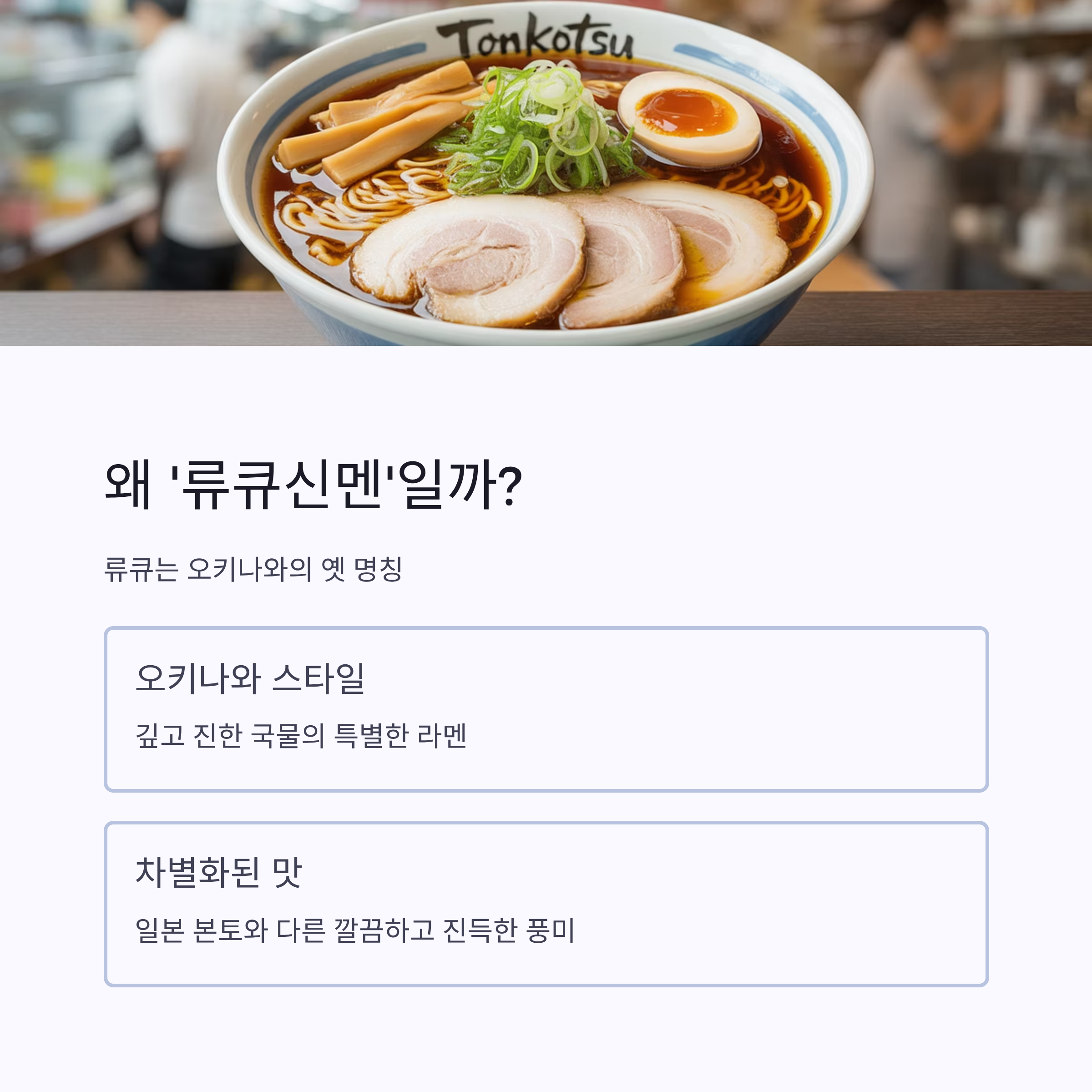 즉, ‘류큐신멘’은 오키나와 스타일의 깊고 진한 국물 라멘을 의미해요.