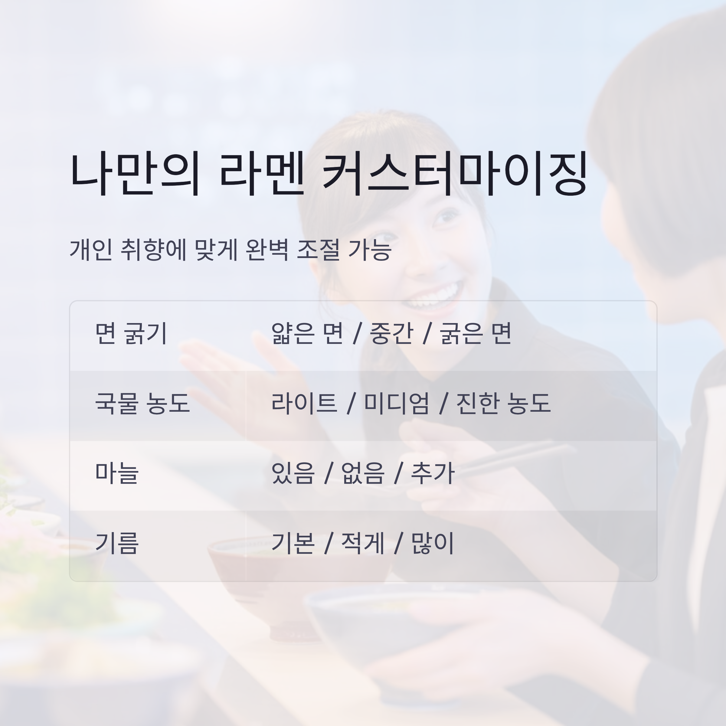 면 굵기, 국물 진하기, 기름의 양, 마늘 유무까지 모두 커스터마이징이 가능해요.