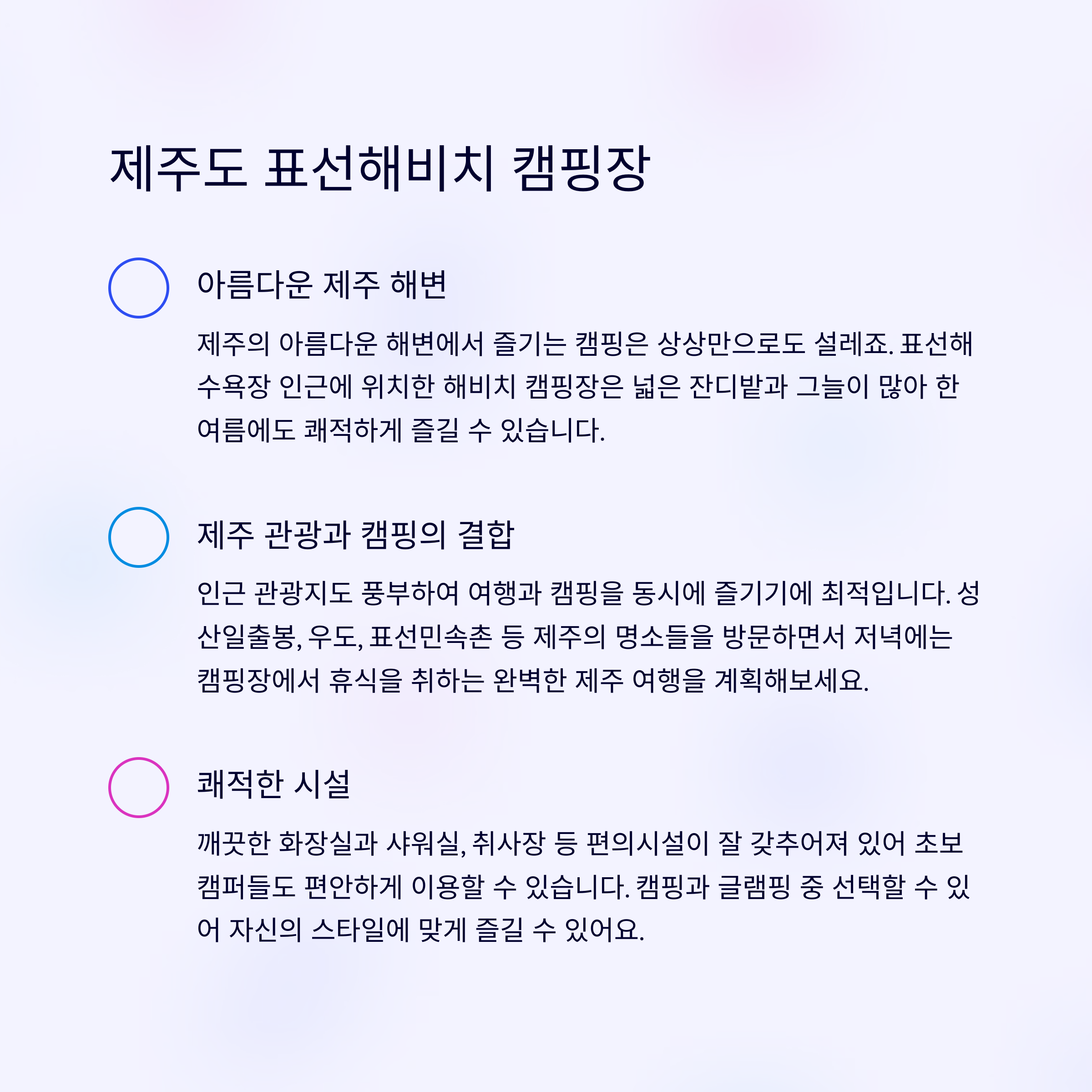 제주의 아름다운 해변에서 즐기는 캠핑은 상상만으로도 설레죠.