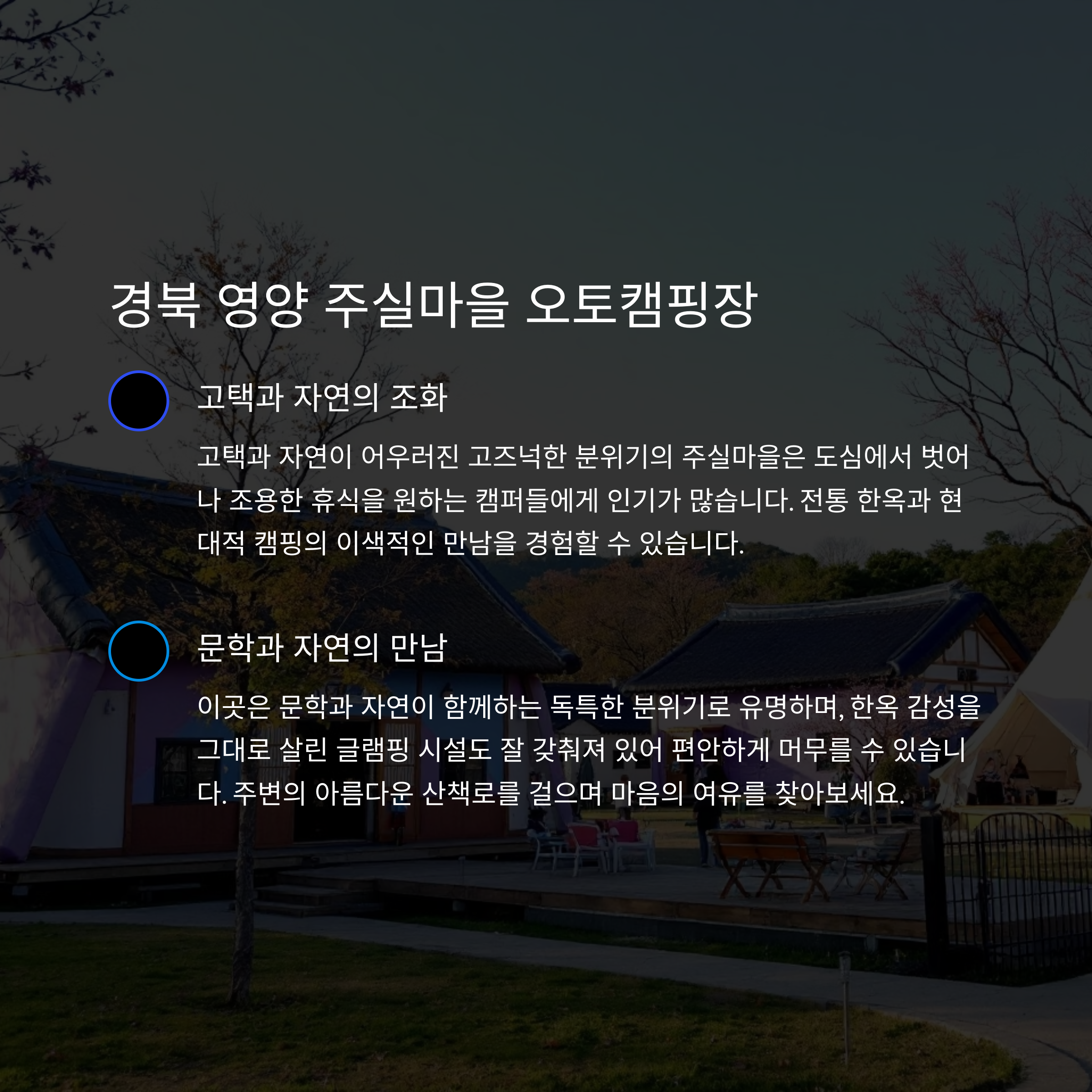 도심에서 벗어나 조용한 휴식을 원하는 캠퍼들에게 인기가 많습니다.