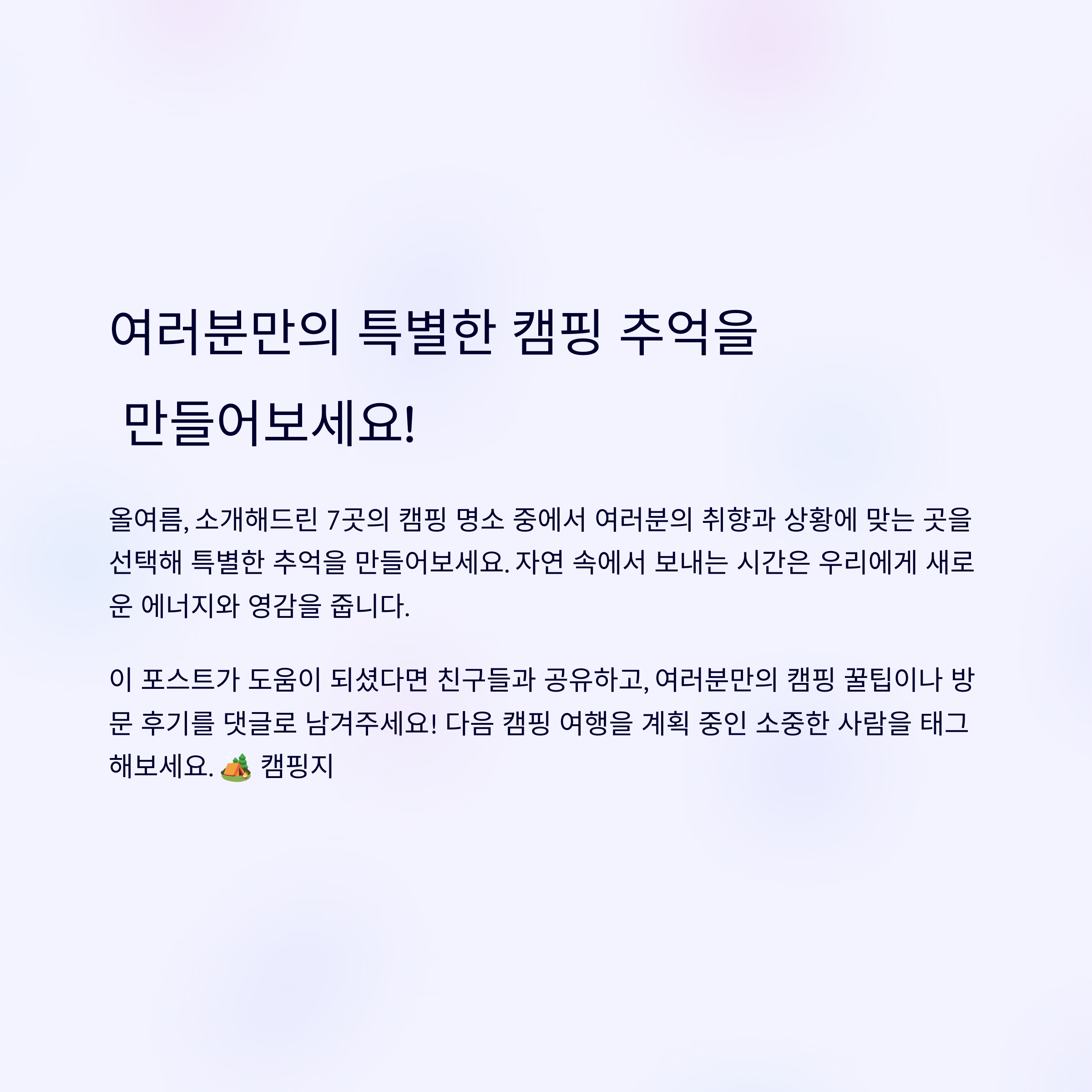 본격적인 여름휴가 시즌을 앞두고 많은 분들이 캠핑 여행지를 고민하고 계실 텐데요. 시원한 계곡, 푸르른 숲 속, 아름다운 바닷가 등 자연과 어우러진 국내 캠핑 명소들이 인기몰이를 하고 있습니다. 이번 글에서는 올여름 가족, 연인, 친구와 함께 떠나기 좋은 캠핑 핫플레이스 7곳을 소개해드리며 각 장소의 특징과 매력을 꼼꼼히 알려드릴게요.