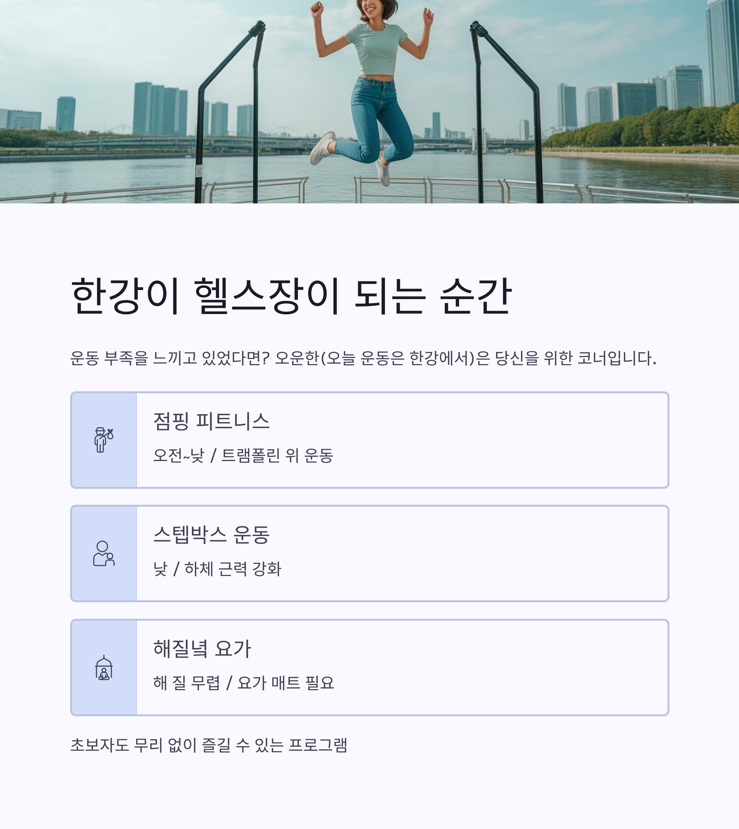 이번 축제의 핵심 프로그램 ‘오운 한(오늘 운동은 한강에서)’은 당신을 위한 코너입니다.
