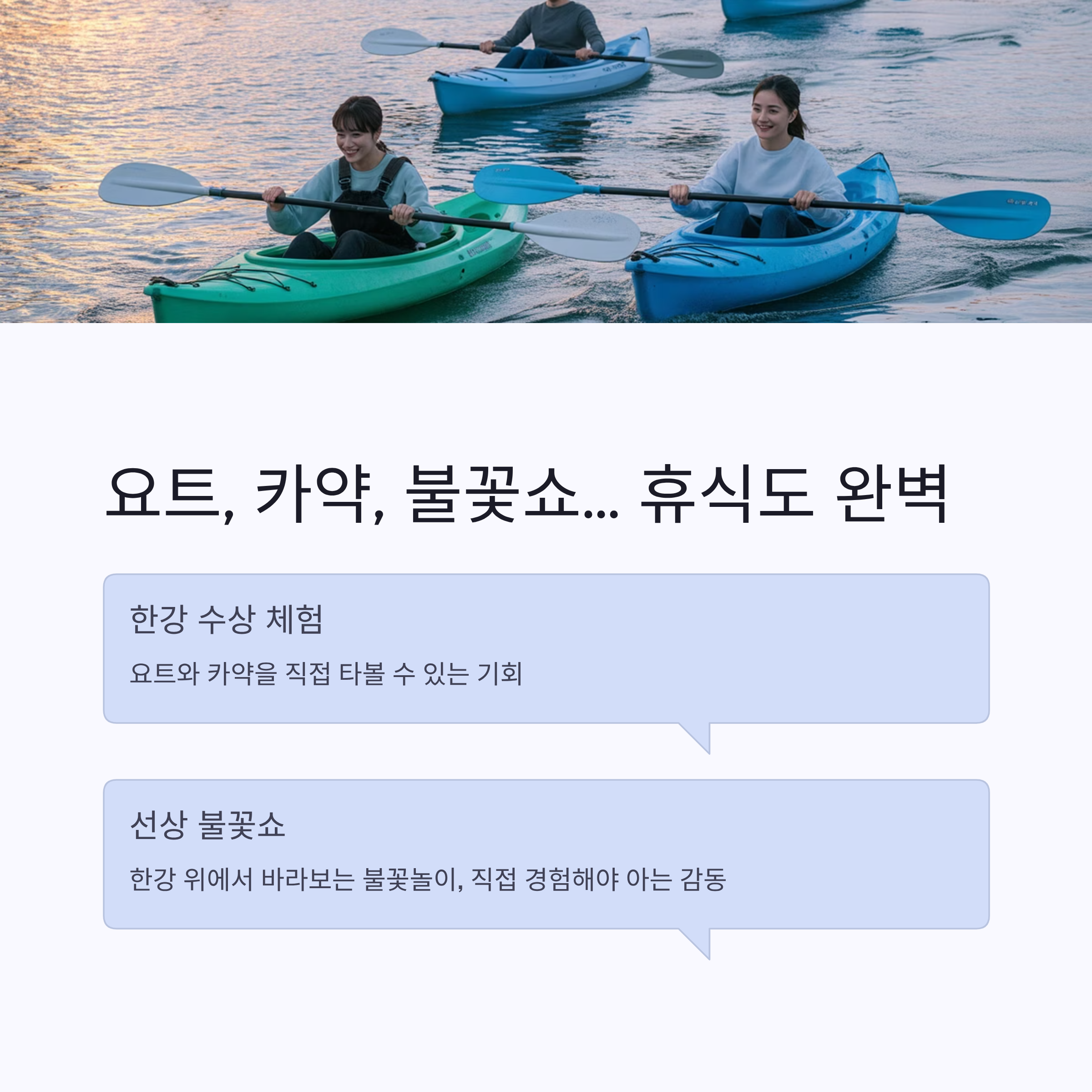 조금 더 여유로운 시간을 보내고 싶다면 한강 수상 체험 코스를 추천해요.