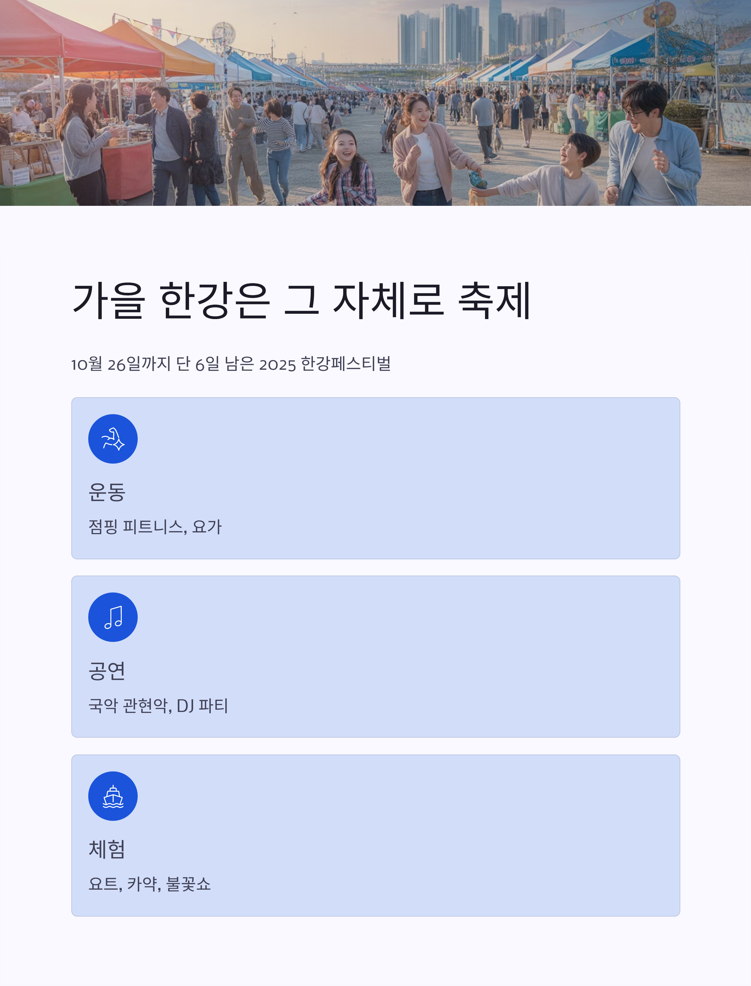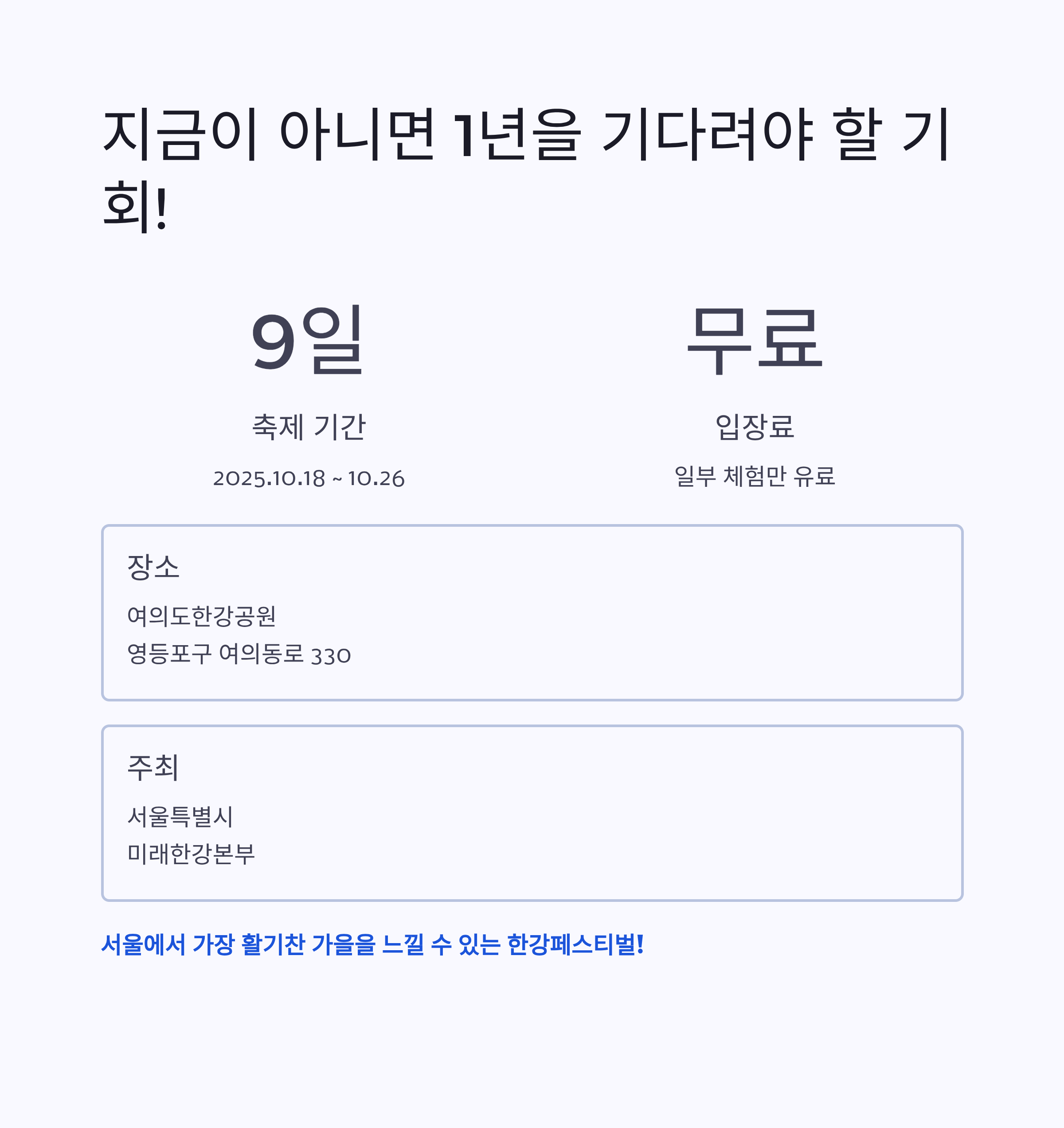 10월 26일까지 단 6일 남은 2025 한강페스티벌에서는 운동, 공연, 휴식, 체험이 모두 가능한 복합 문화 이벤트가 진행되고 있어요.