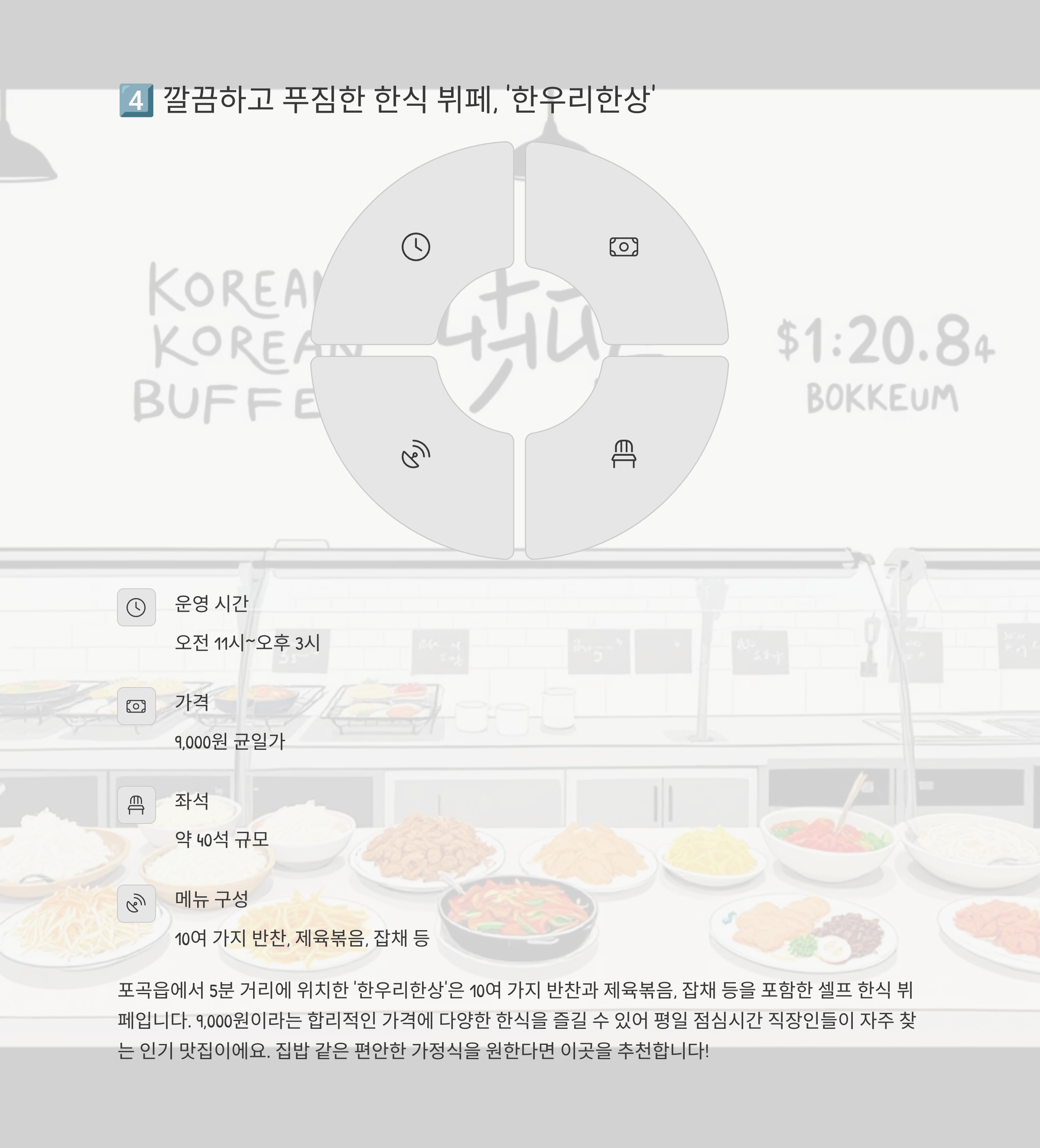 | 대표메뉴 | 돼지갈비, 된장찌개 |
