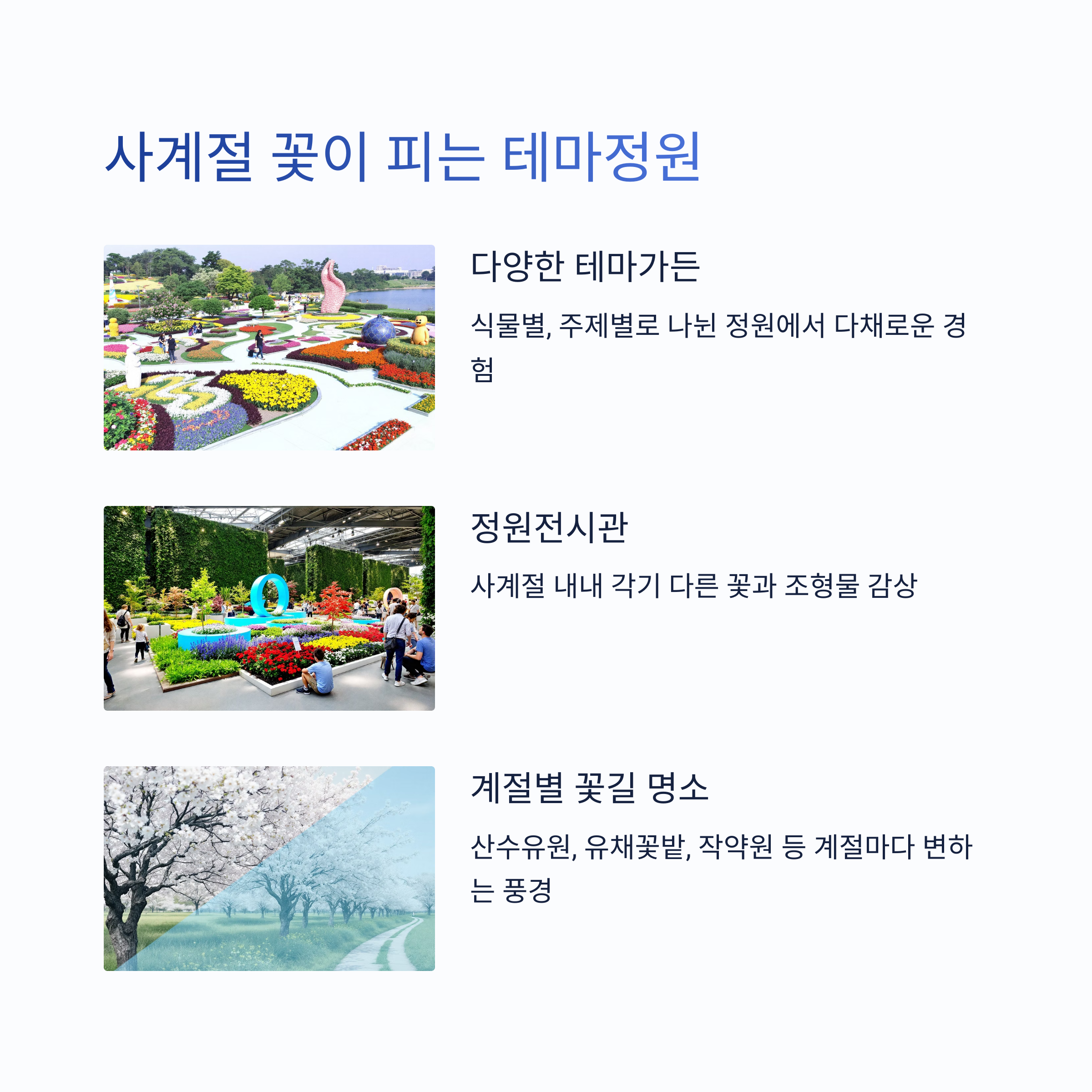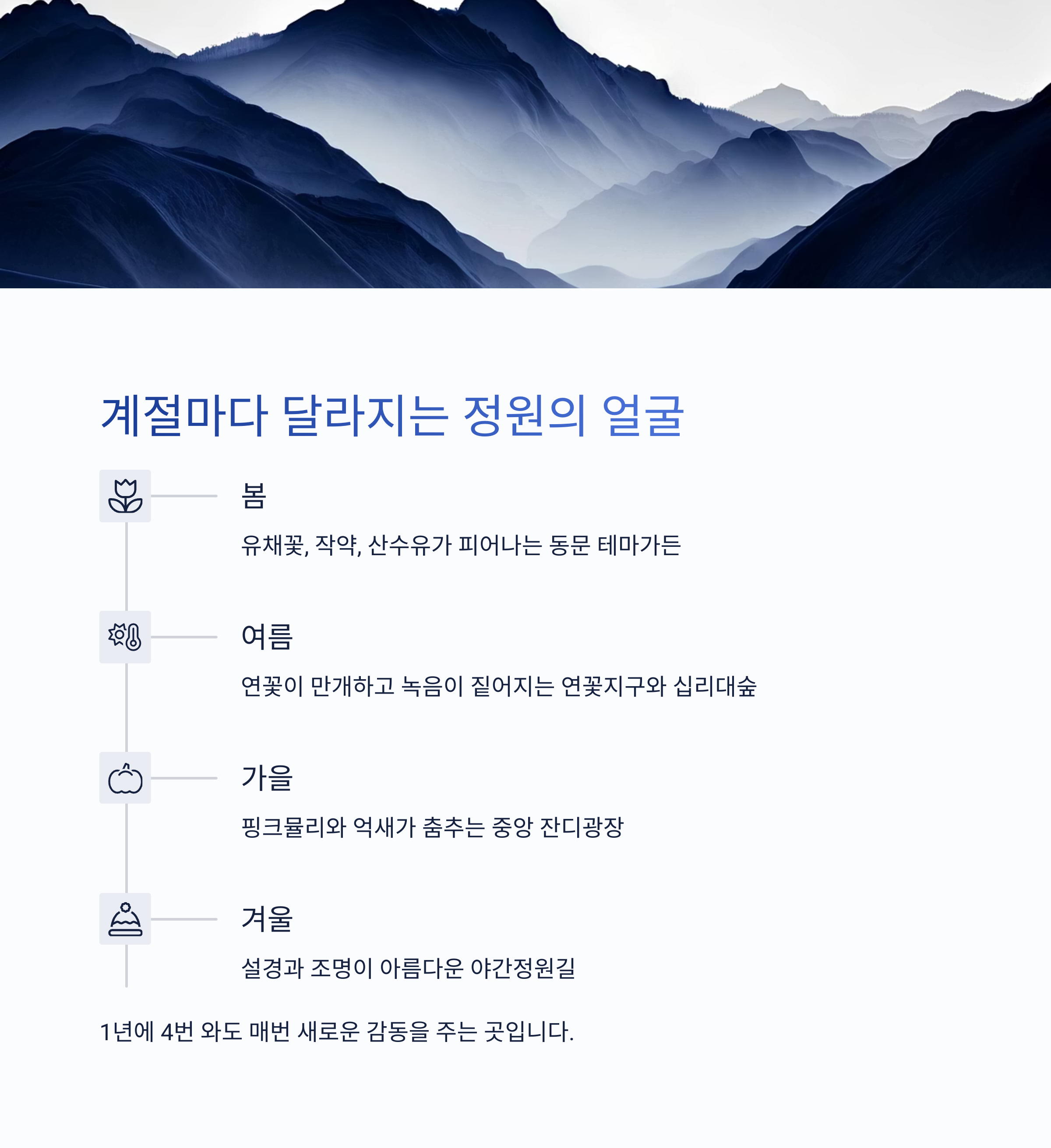 사계절 내내 각기 다른 꽃과 조형물이 정원 여행의 재미를 선사합니다.